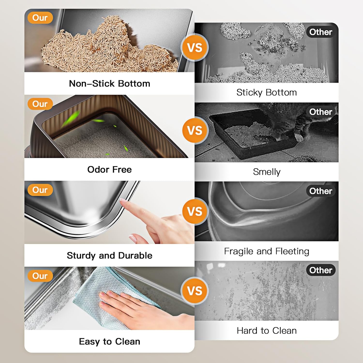 - [Makes clean up easy] The metal litter box with lid consists of a extra large stainless steel litter box and an ABS top lid, Smooth stainless steel cat litter box anti rust,anti stick,less likely to get scratched and have all those scratches for smells to hide in, Doesn't absorb odors and stains like plastic litter boxes do, and easier to clean