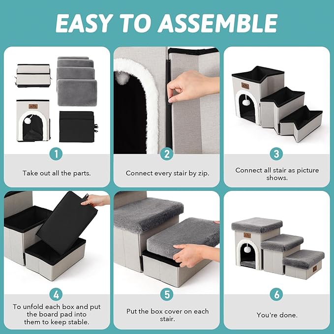 - EASY TO ASSEMBLE AND STORE: Stairs for dogs to get on bed come with detailed assembly instructions and can be quickly assembled without the need for tools. Simply zip the steps together and add the bottom cushion for a solid dog ladder. When not in use, the cover can be removed, and the stairs can be folded up for easy storage.