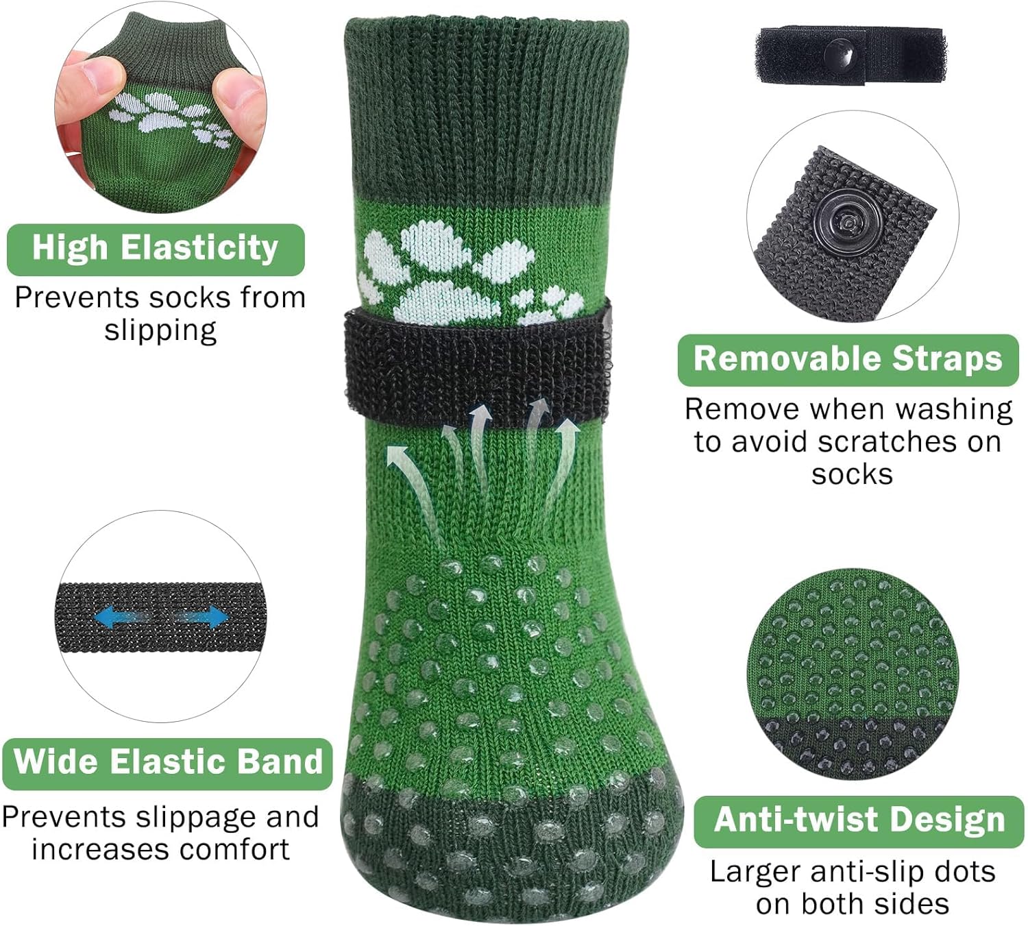 • ANTI-FALLING ELASTIC BAND DESIGN: Extra adjustable, removable waistband allows the socks to fit snugly on playful pet's paws, not easy to fall off. You can use the black elastic loops to adjust the tightness of your dog's socks (Note: Don't fix it too tight, so your dog will feel comfortable) Let your dog won't fall off even during walks or runs.