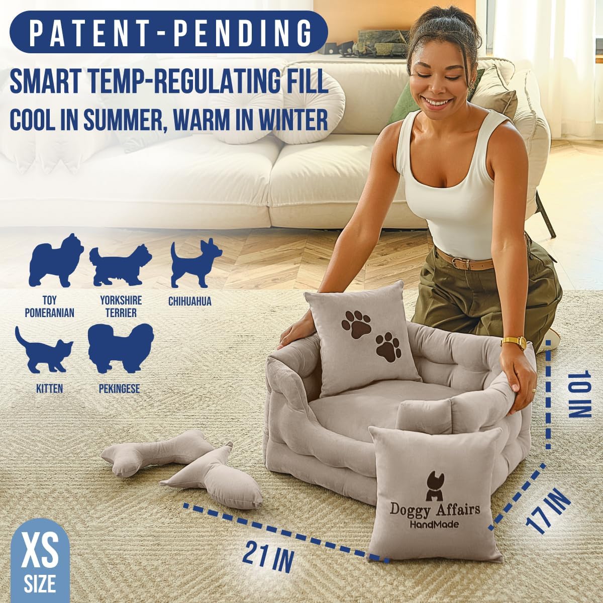 Luxury Dog Bed Chesterfield – Handcrafted Velvet Throne for Dogs | Joint Support, Calming & Temp-Regulating Comfort | Durable 5+ Years, Anti-Claw, Washable 100+ Times –Ivory, Size: XS