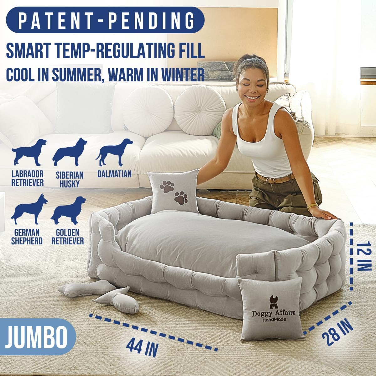 - JOINT SUPPORT COMFORT & TEMP REGULATION: Premium cushioning supports joints, hips, and growing bones, while smart fill keeps her cool in summer and warm in winter. The only calming dog bed that truly hugs her back like your arms.