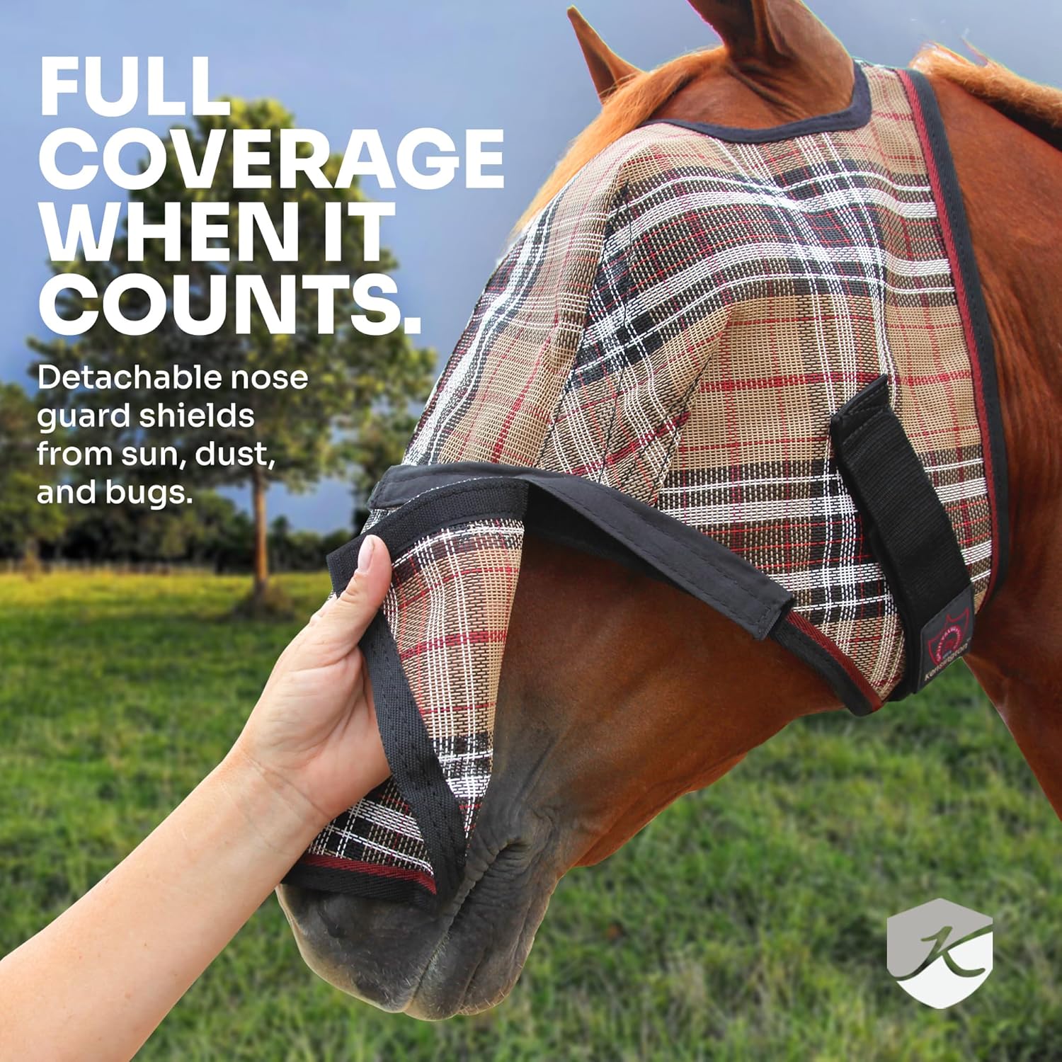 Kensington Signature Fly Mask with Removable Nose — Protects Horses Face and Nose from Biting Insects and UV Rays While Allowing Full Visibility — Ears and Forelock Able to Come Through The Mask