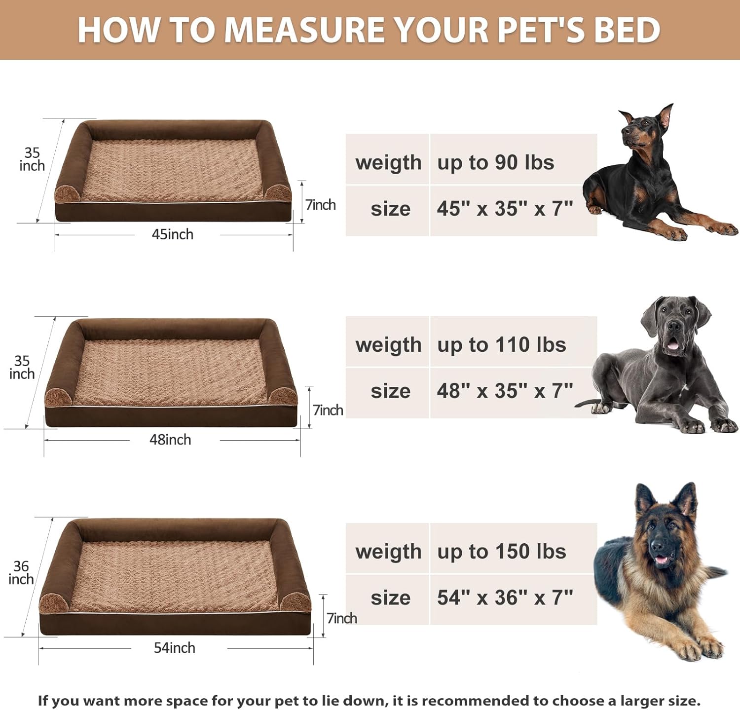 • DIMENSIONS (DOG BEDS FOR MEDIUM DOGS): jumber plus dog bed 48" x 35" x 7" (3.5" bolstered side ) for medium and large dogs up to 110 lbs. For dogs that like to roll around, sizing up will be more comfortable.