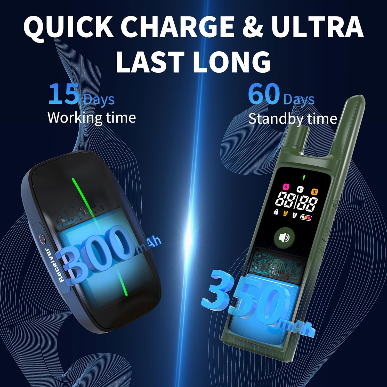 - 【Fast Response Speed & Super Easy to Use】 Dog shock collar with remote upgraded smart AI chip to enhance 8X faster response time. Click the button, the signal will be transmitted to the collar within 0.01S, up to 3300ft remote range. Ensuring your commands are accurately and immediately communicated. This enables your furry companion to understand without confusion. With large buttons and a clearer, larger display. The battery life of both the remote and receiver is shown on the screen.
