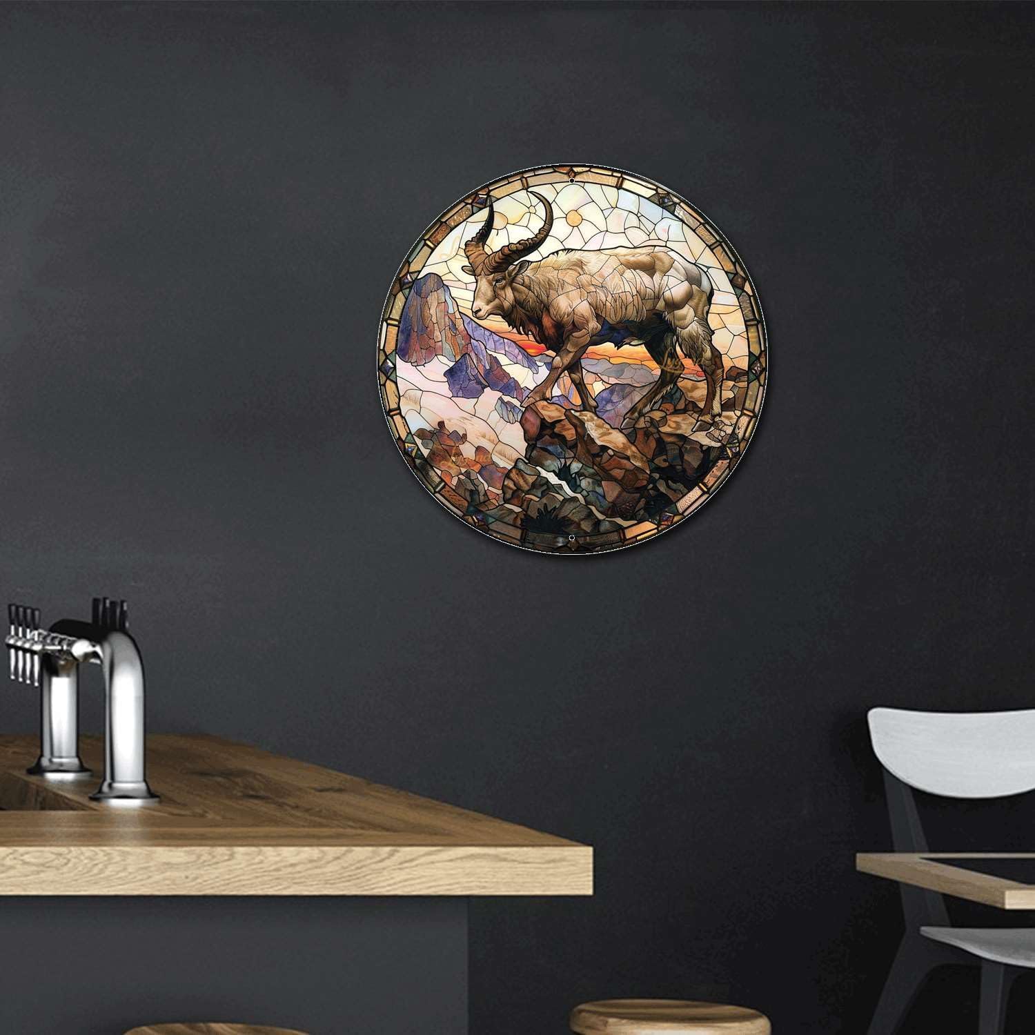Lygond Metal Sign Tin Sign Circular Stained Glass Mountain Goat Tin Sign Gift for Garage 12×12 Inches
