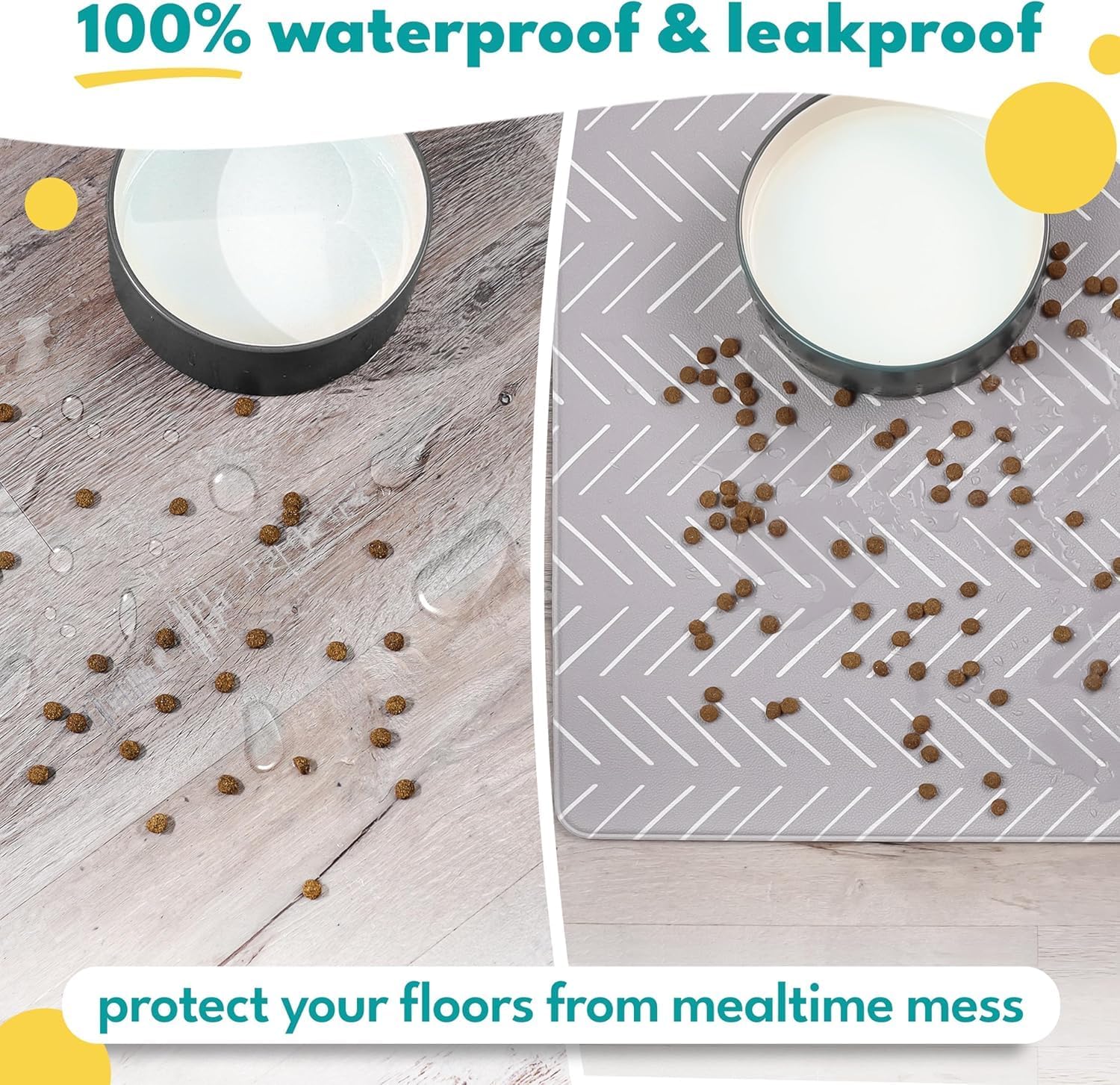 - WATERPROOF & EASY TO CLEAN – Unlike silicone dog food mats, our waterproof pet feeding mat resists pet hair, staying cleaner for longer. When messes happen, simply wipe down. Perfect for dog and cat bowls, this easy-to-clean mat keeps your pet's feeding area neat and hassle-free.