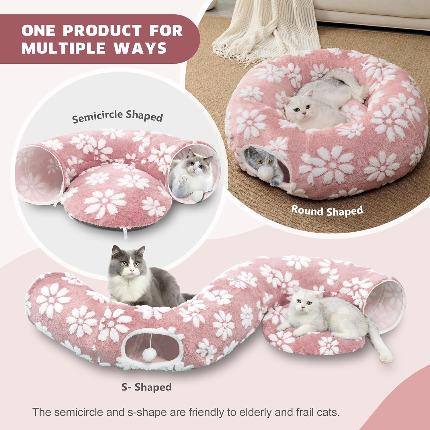- Versatile Cat Tunnel: Unlike normal single S-shaped or T-shaped tunnels, this cat bed tunnel consists of two semi-circular tunnels and a round soft cushion. This design allows pets to freely switch between entertainment and rest. It can perfectly accommodate small pets up to 15 pounds such as cats, rabbits, or ferret. Pets can immediately have a cozy and peaceful place to rest after exciting games. Perfect for families with multiple furry pet friends. Not just a toy, but also a bed