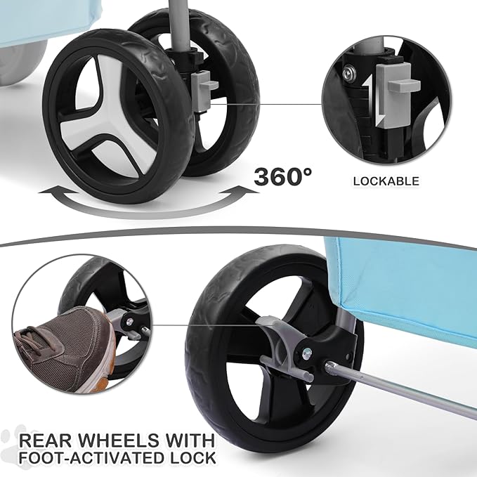- Advanced Braking System - The two rear wheels of our pet stroller are equipped with brake protection devices, so you can park your stroller safely and securely even on inclined surfaces.