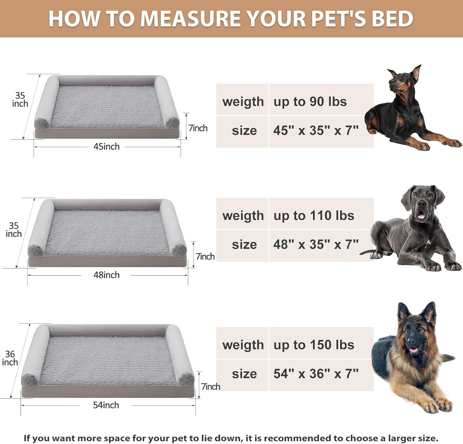 • DIMENSIONS (DOG BEDS FOR MEDIUM DOGS): jumber plus dog bed 54" x 36" x 7" (3.5" bolstered side ) for medium and large dogs up to 150 lbs. For dogs that like to roll around, sizing up will be more comfortable.