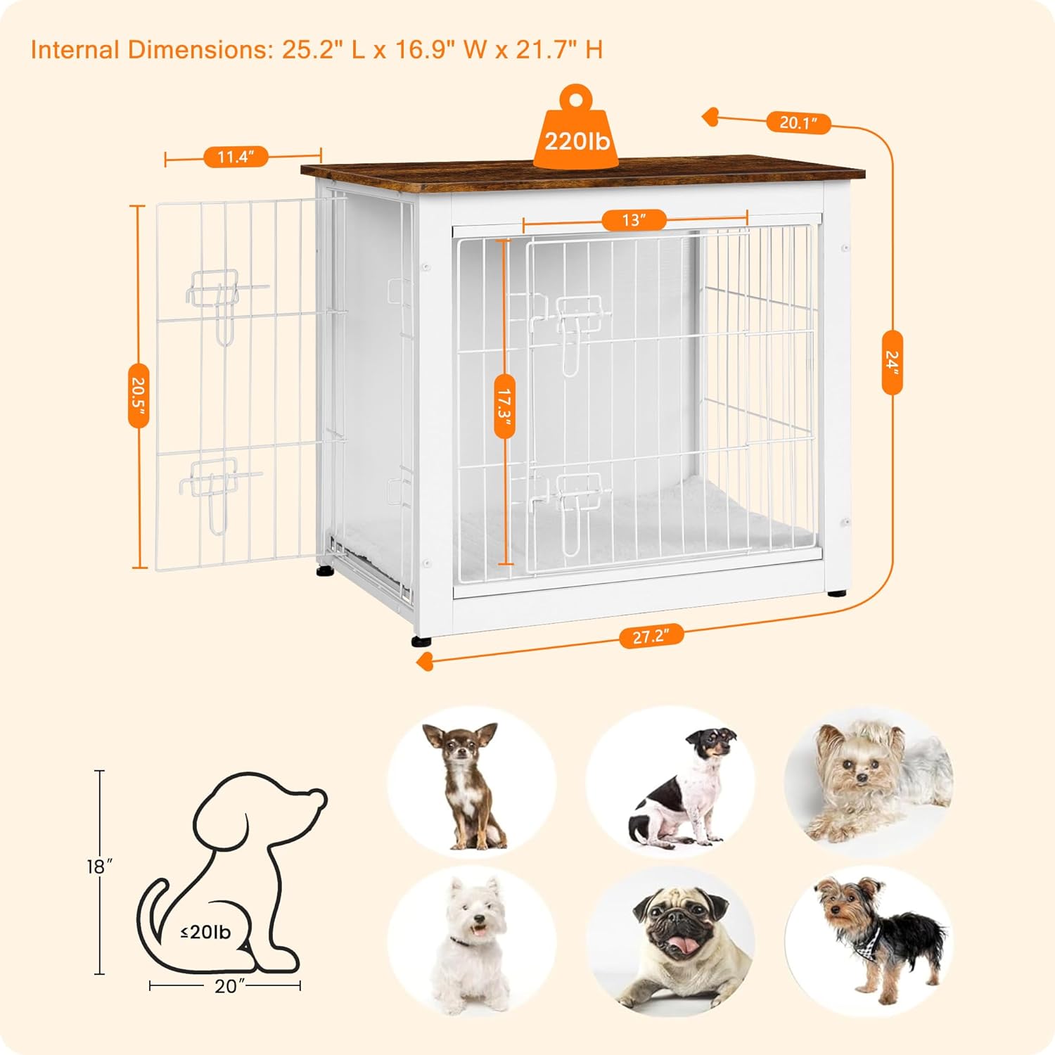 DWANTON Dog Crate Furniture with Cushion, Wooden Kennel Table with Double Doors, Indoor Dog House, Small/Medium/Large Size, 27.2" L, White+Rustic Brown