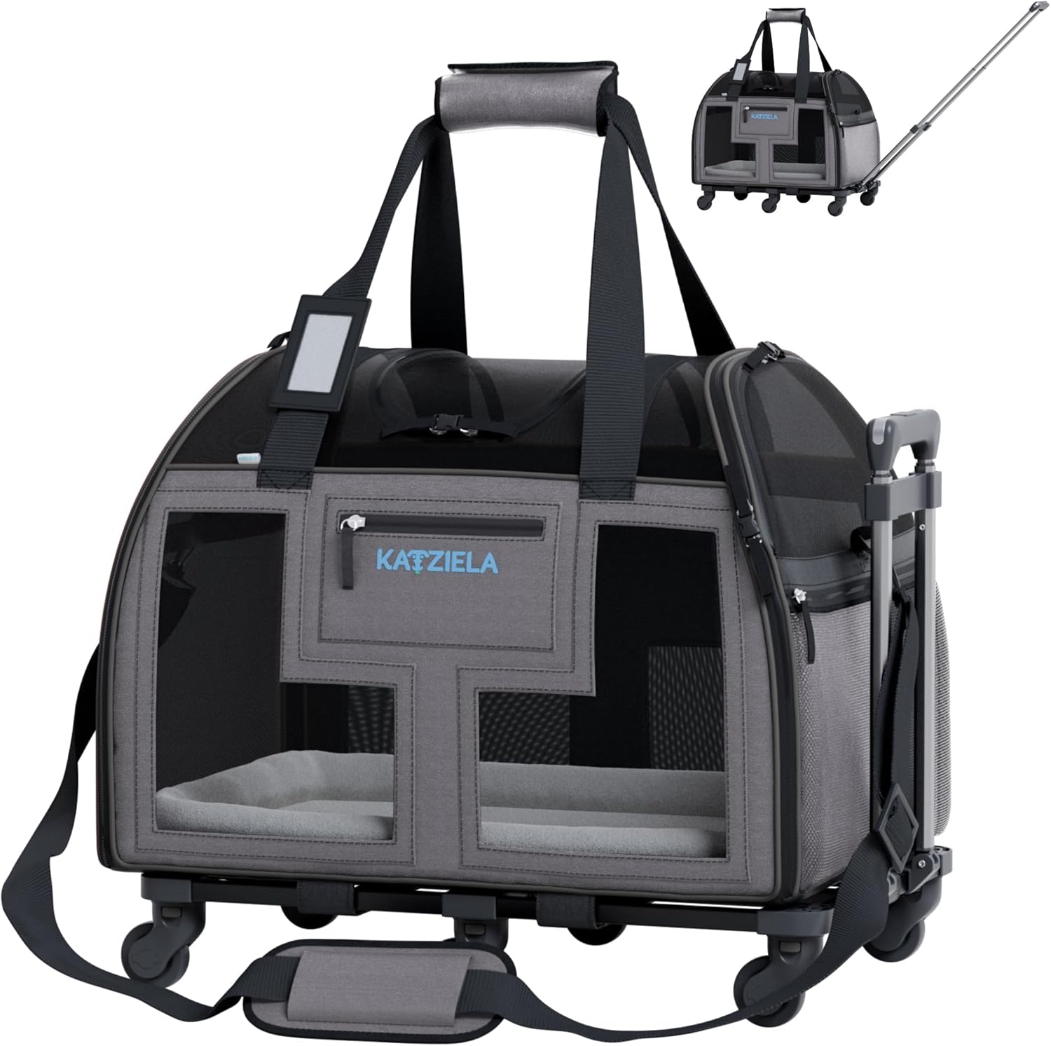 Katziela Airline Approved Pet Carrier - Rolling Portable Travel Carry Crate for Small Dog, Puppy or Cat - Soft Removable Wheeled Design with Mesh Window Sides - Airplane and TSA Compliant (Dark Grey)