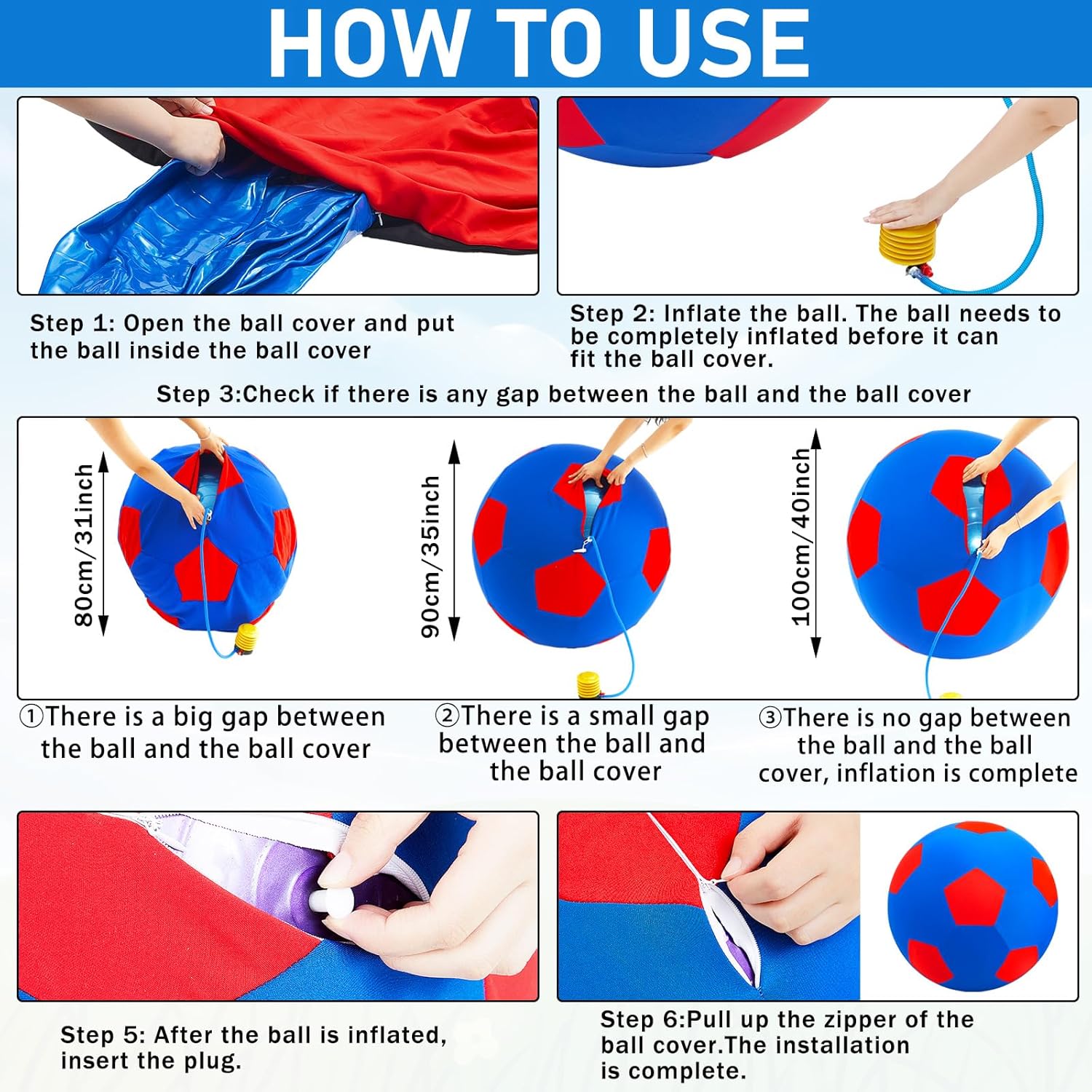 - Large Enough Size: when the horses toy is inflated to less than 40 inches, it cannot fit into the ball cover; Please continue to inflate it without worrying about the ball bursting; When it is inflated to 40 inches, it can fit into the ball cover completely without any gaps