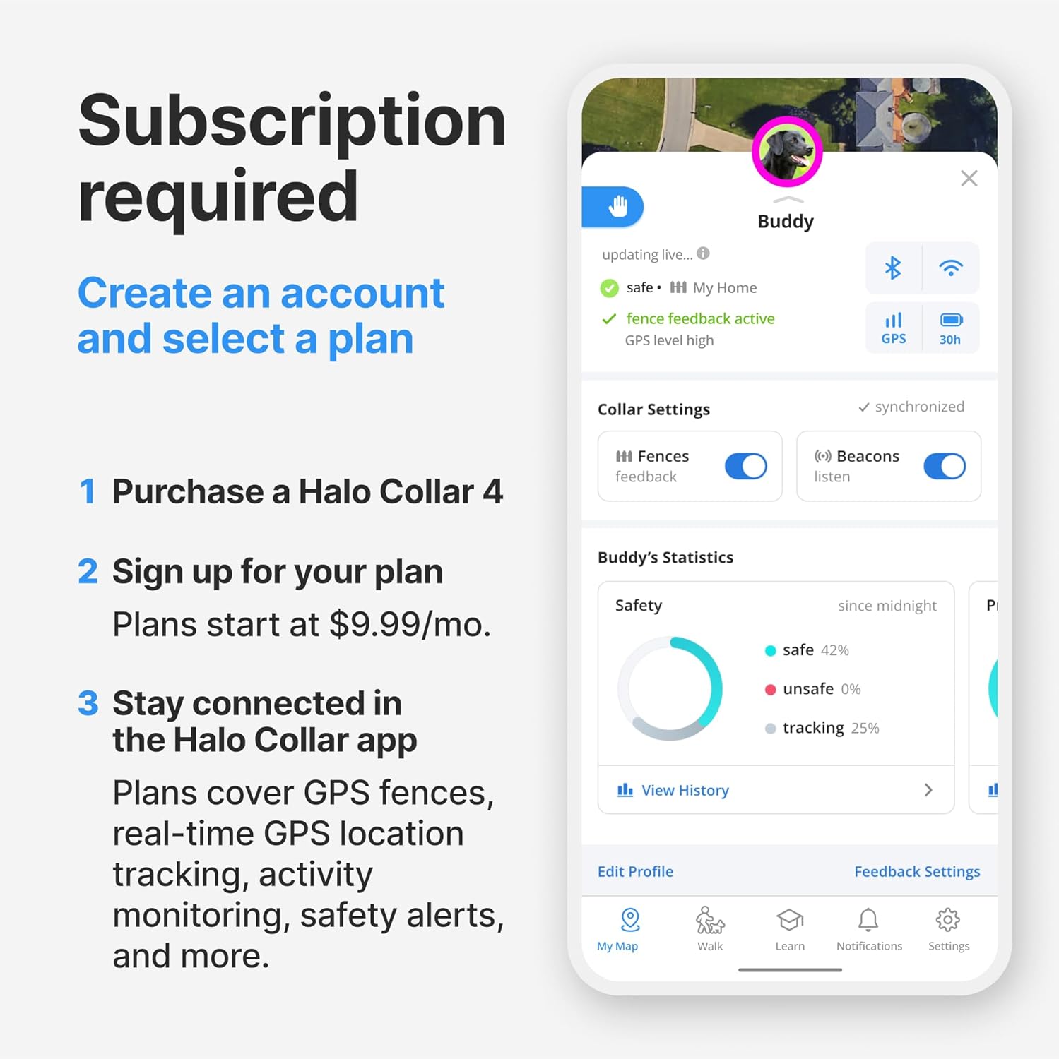 - SUBSCRIPTION REQUIRED: Your collar needs GPS services and cellular data to create, edit, and use the wireless dog fences and GPS tracking. Pack Membership Plans start at $9.99 per month. Select a plan after purchase
