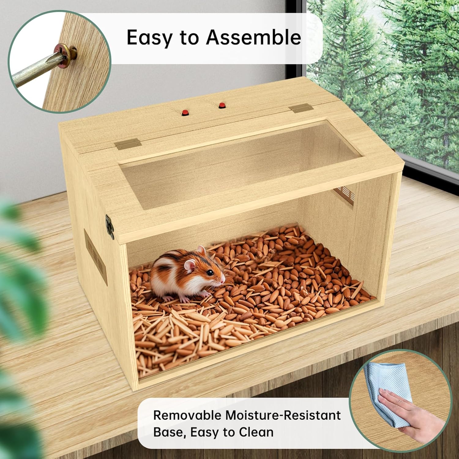 - Easy assembly and cleaning: Designed for easy assembly, it can be quickly installed by following the provided detailed instructions. The bottom of the hamster enclosure features a waterproof acrylic panel, making it convenient to clean and maintain your pet's hygienic living space