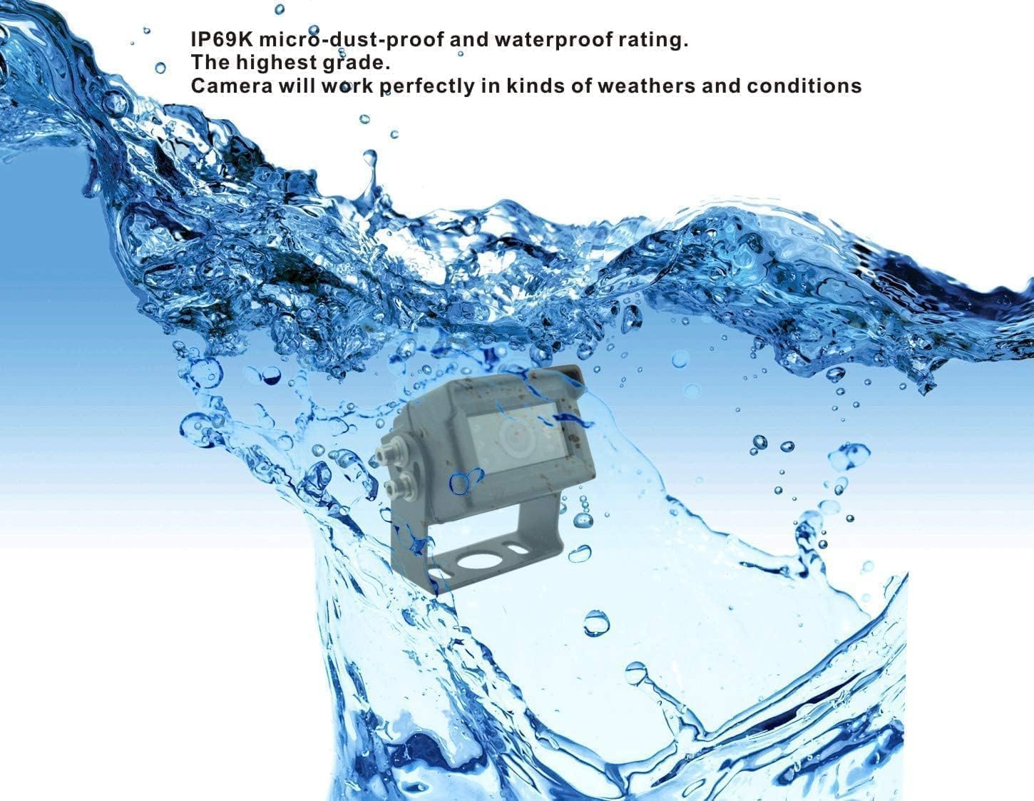 - 【HEAVY DUTY CAMERA】It is color camera with the resolution of 1080P, provides super clear and real color image. The viewing angle is 120 degree. With waterproof rating IP69K(the highest level), with night vision. So it works perfectly in kinds of weathers. With Heavy duty, 10G vibration-proof rating, it works well with the vehicle which has intensive vibration in extreme conditions.