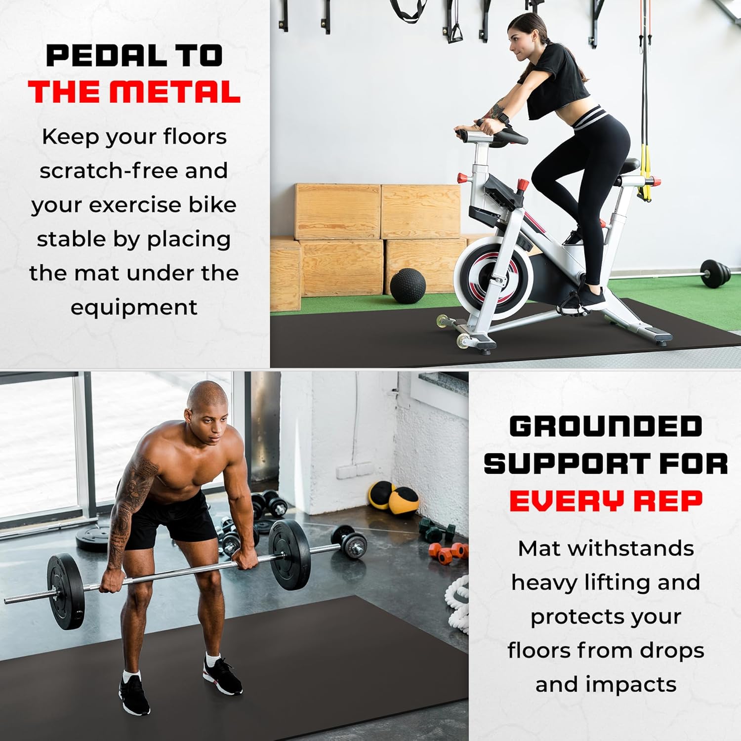 - PREVENT FLOOR SCRATCHES when you're doing your fitness regime by setting your extra large exercise mat underneath your walking pad, spin bike, or rowing machines. Forget about sliding issues as our non-slip thick workout mats grip firmly on all surfaces
