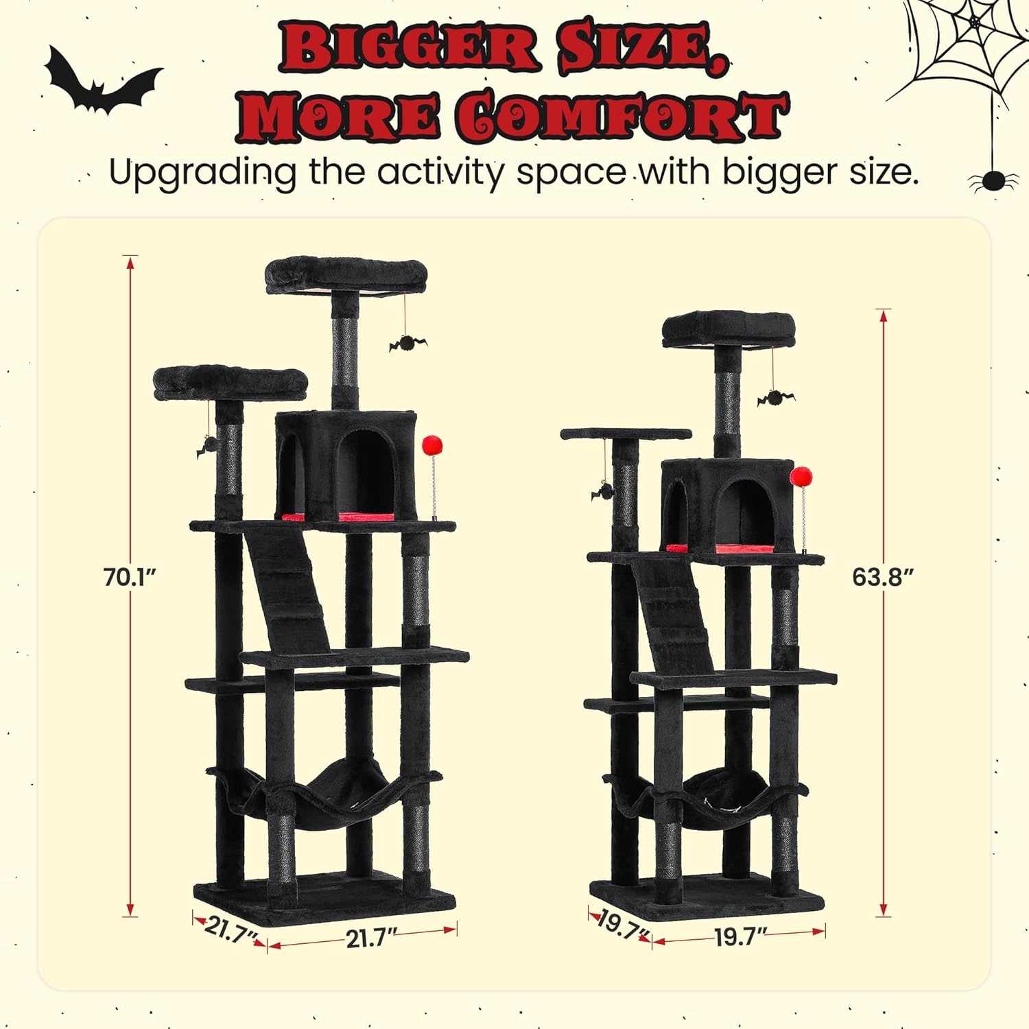 - Larger Size Gothic Design: This elegant black cat tree, accented with red, features a spider web-patterned hammock and bat-shaped dangling toys. Its gothic design will easily attract your cat