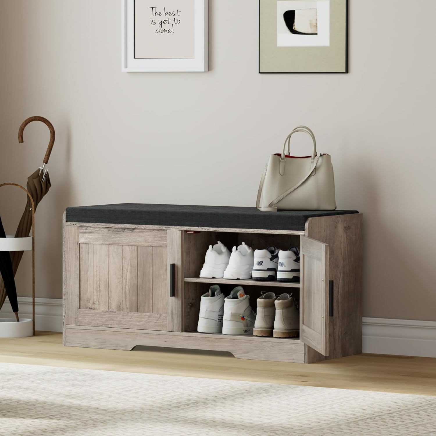 - More Comfortable Shoe Change Cabinet: With a 2-inch thickened padded sponge cushion on the bench top, you can change shoes by sitting on the bench more comfortable without bending down or squatting