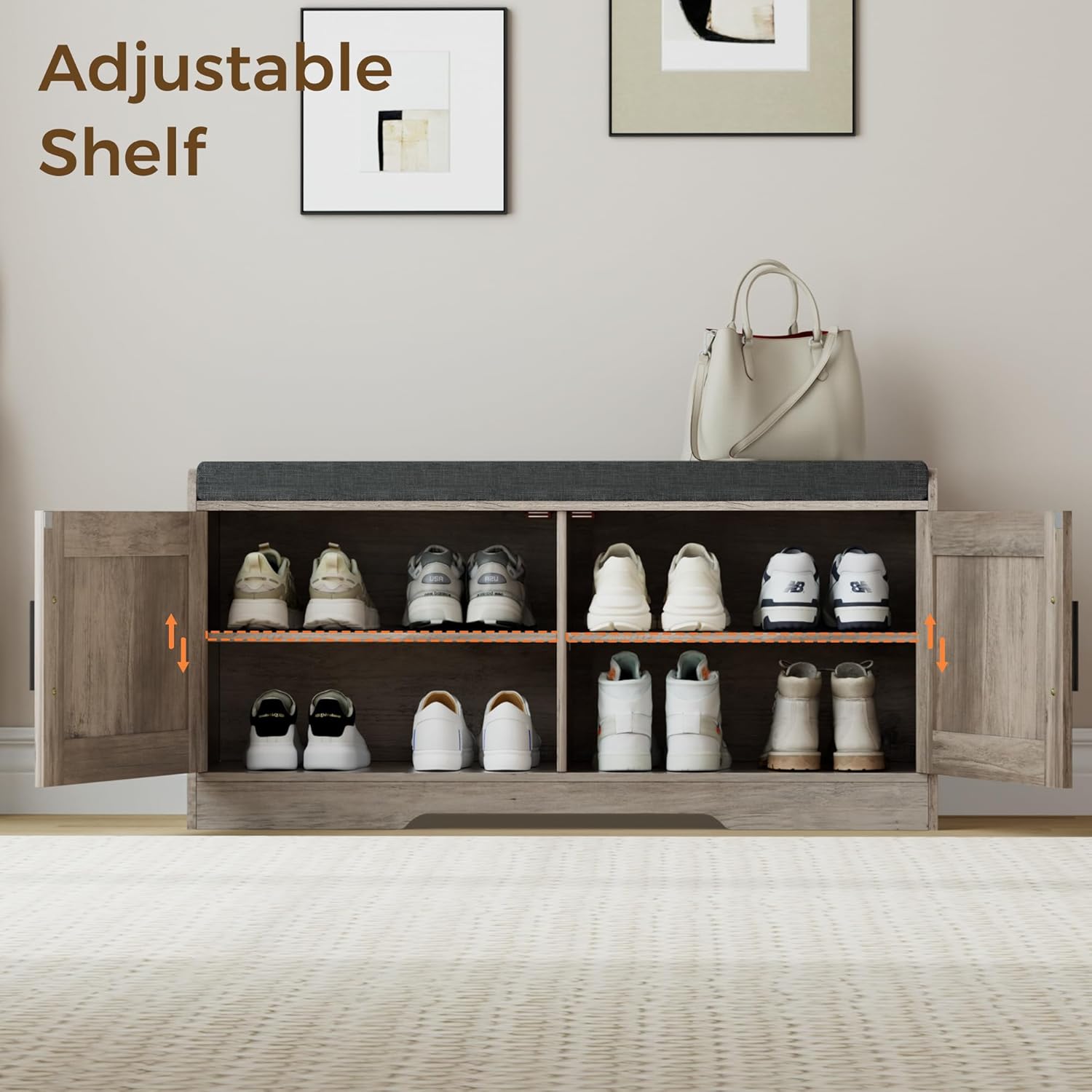 - Keep Your Shoes Organized: The depth of bench is 13.8 inches, which makes it easily to put in your shoes, meanwhile shoes of various heights can be placed by adjusting middle movable boards. The bench doors design ensures not only your privacy, but also a tidy space