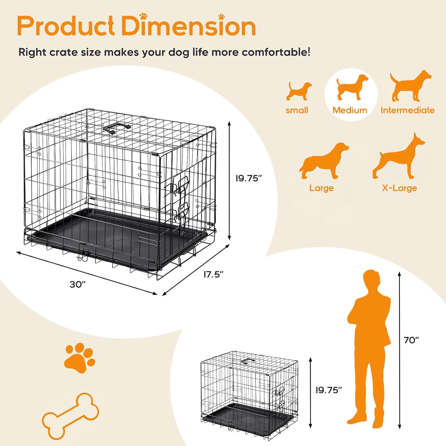 - Double-Door Dog Crate: Measuring at 30.31 x 17.91 x 19.49 inches, this crate is designed for medium dog breeds weighing between 25 to 40 pounds. If your dog's weight or size falls on the higher end within this range, we recommend purchasing the next size up crate for optimal comfort and space.