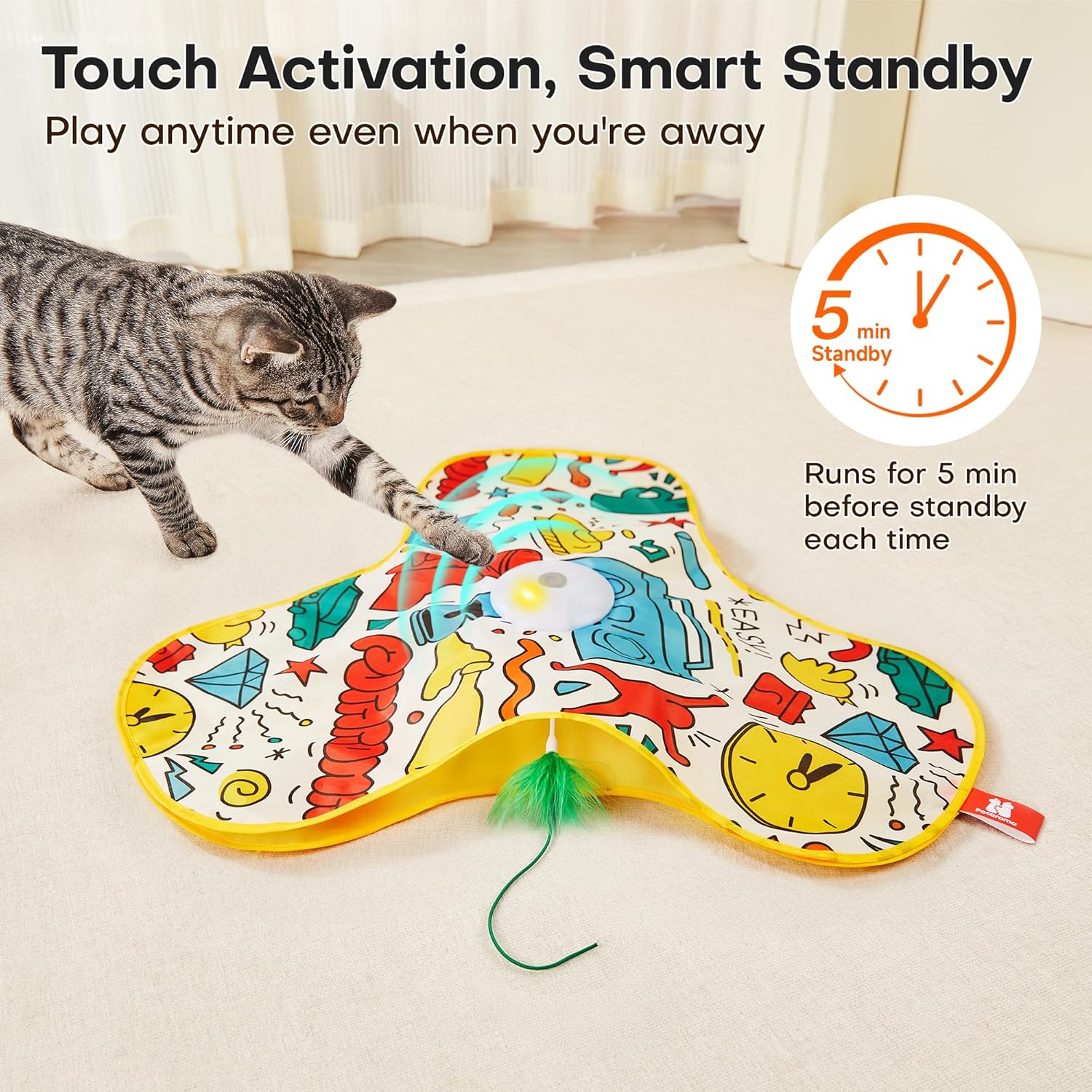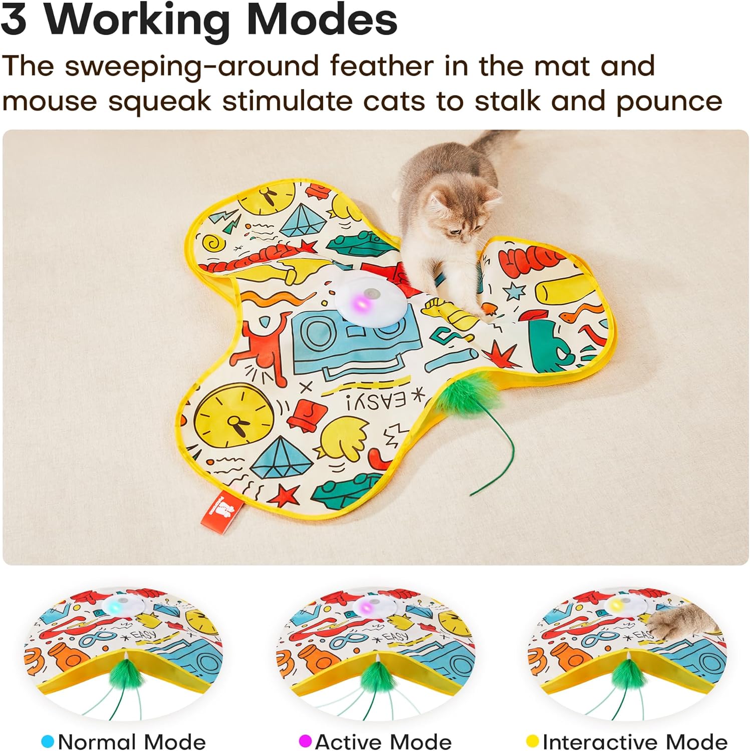 - Smart Motion Sensor & Three Modes – Equipped with intelligent touch activation, this electronic toy allows your cat to self-play by simply touching the toy. Choose from three adjustable modes: normal, active, and interactive, keeping your cat energized and reducing boredom for hours of indoor fun and enrichment.