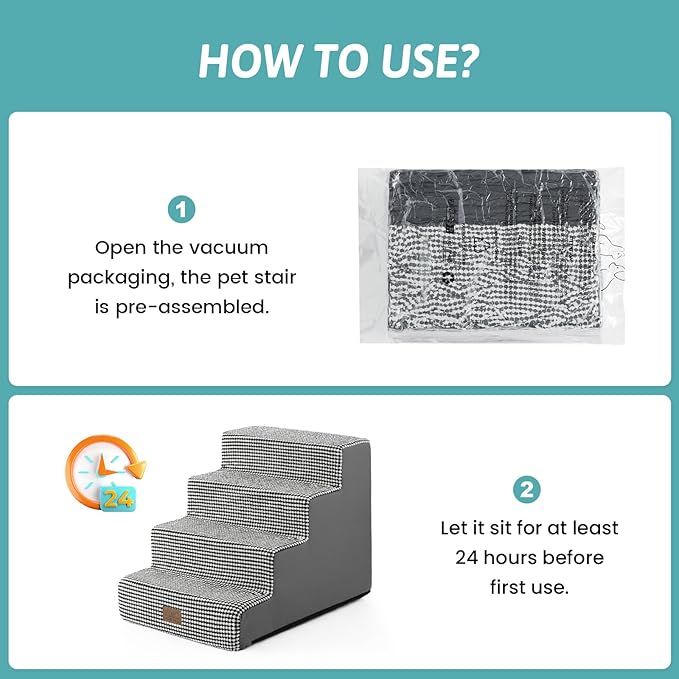 - Easy to Use: Dog stairs are vacuum-compressed and packed together after assembly, so after taking it out of the vacuum-sealed package, please let the sponge sit for 48 hours to expand before use fully. Slight wrinkles on the cover sides may appear after unpacking but can be smoothed out by washing or ironing