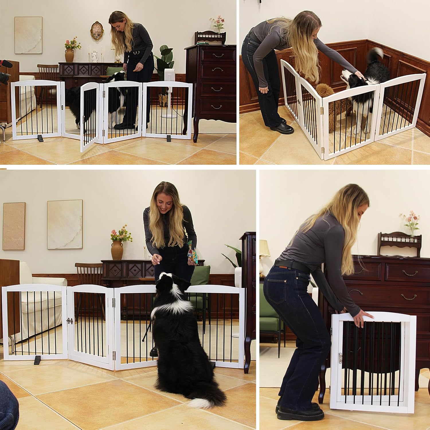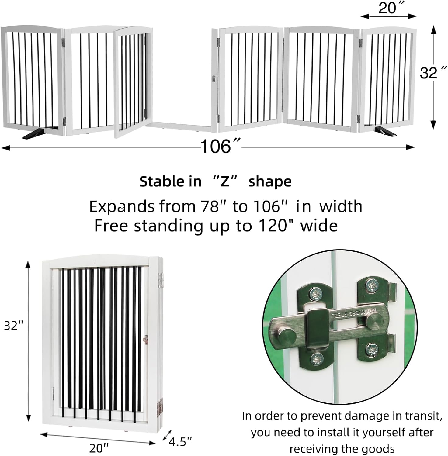 - 【Pet Gate with Door】: The pet gate Includes a lockable door . Pet gate is built with 6 separate panels, secured together with sturdy hinges allowing,Two support feet for additional balance.