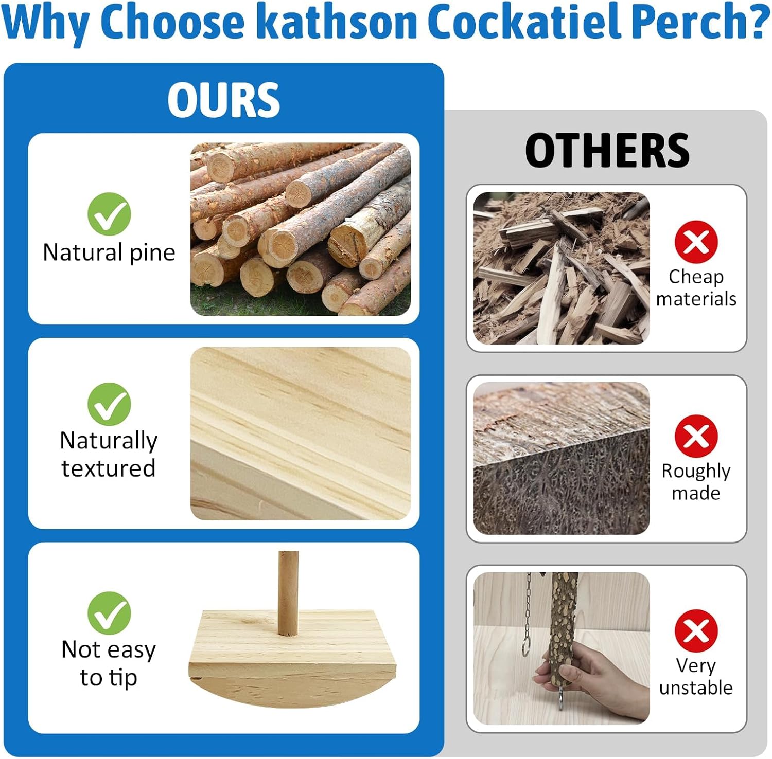 - NATURAL MATERIALS: Our bird perches is made of pine wood; it is bird friendly; the surface of the T-bracket has an embossed design; when the bird moves on the perch; it can trim excess nails by rubbing; it helps the bird to sharpen its beak; the T-bracket is securely fastened to the base by metal screws; it ensures the stability of the overall structure; we have also used a hidden screw design; there is no unsafe place on the whole bird stand for chewing; not cause unsafe factors for pets