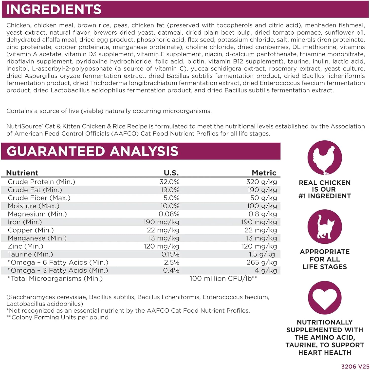 - As a member of our grain inclusive series of cat foods, NutriSource Cat & Kitten Chicken & Rice Recipe is formulated to meet AAFCO guidelines for all life stages