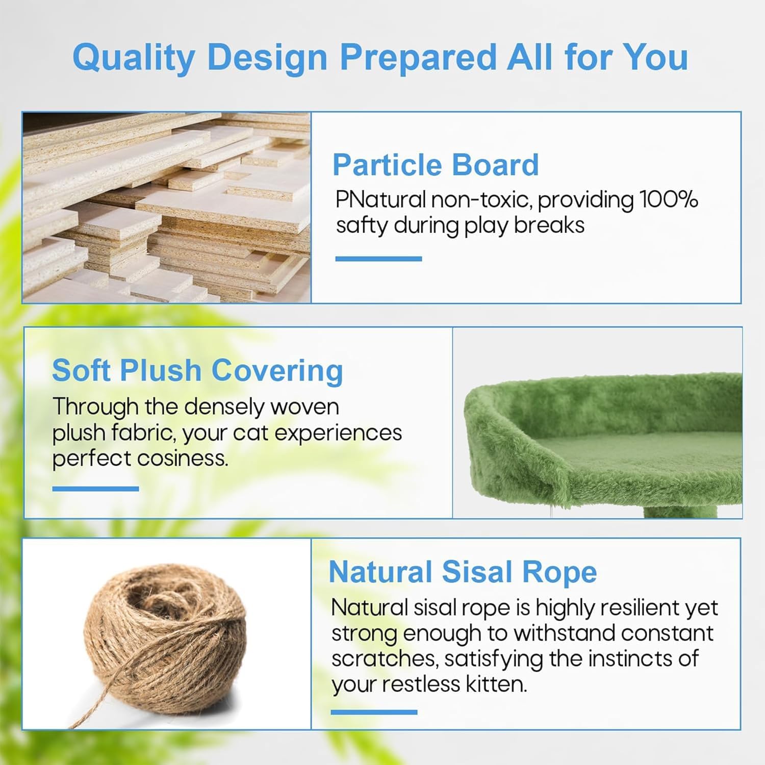 - 🐱 【Posts for Scratching Covered in Sisal 】These are scratching surfaces that are integrated into the framework. Cats love to bury their claws in sisal because it's a sturdy substance with a coarse texture. Our cat tree promotes healthy scratching habits and helps discourage cats from damaging furniture by offering dedicated spaces for them to scratch.