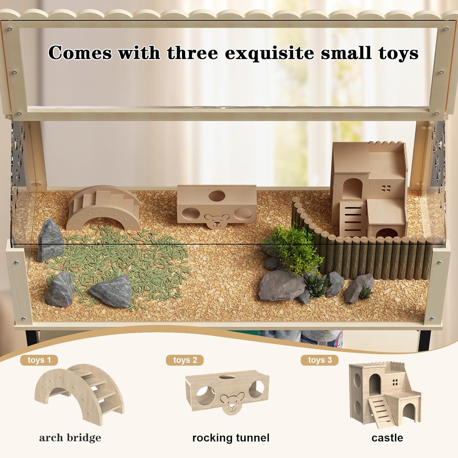 - 💕【Good Ventilation】: The cage is made of wood frame and clear acrylic panels, providing a durable and lightweight structure. The four sides are wrapped with wooden strips to prevent hamsters from chewing on the cage and protect their teeth.