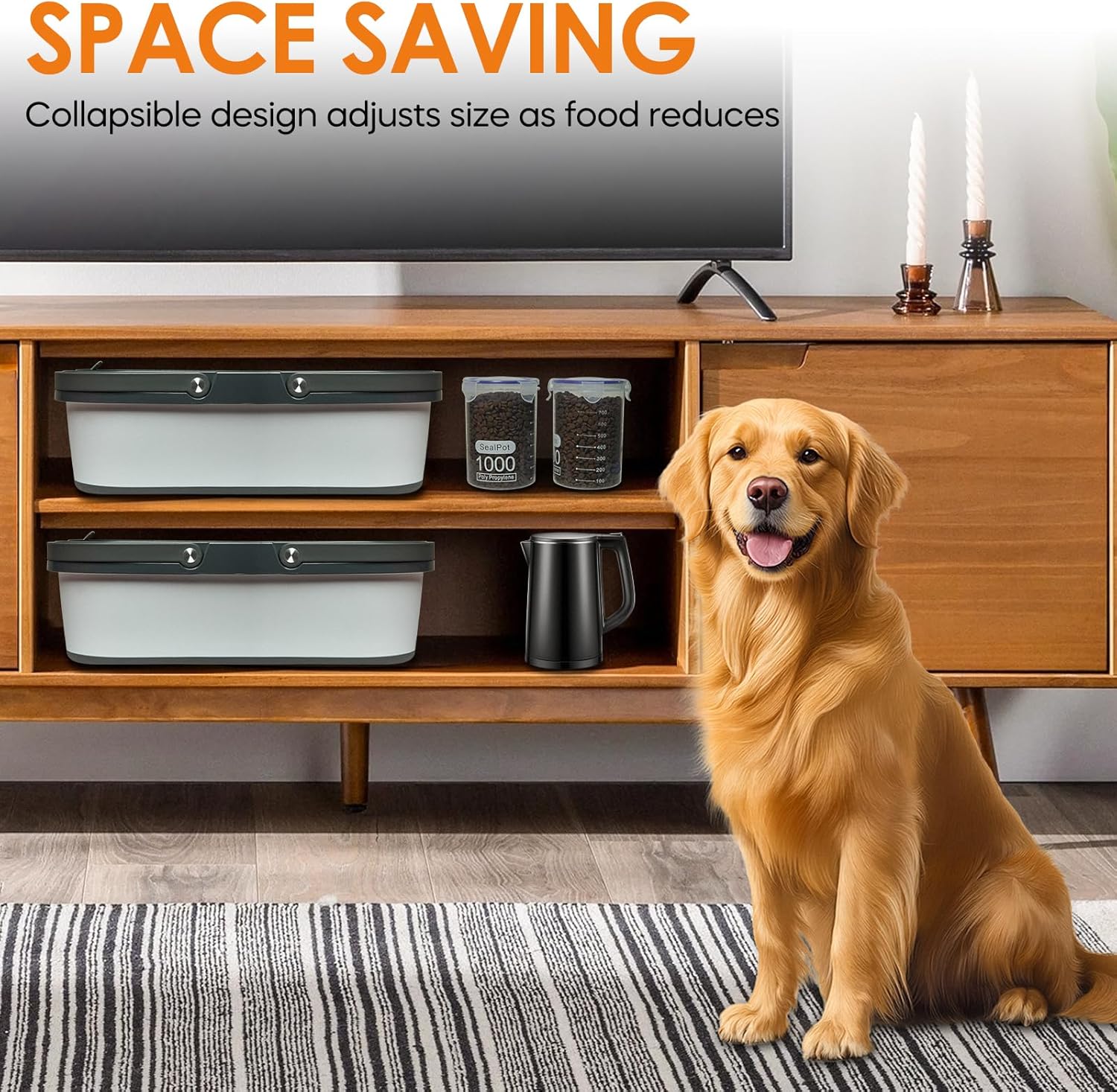 - 【Space-Saving】: Featuring a unique foldable design, this pet food storage bin not only offers convenient storage but also saves space efficiently. It comes in two different sizes. When unfolded, its dimensions are 17.7’’L x 12.9’’W x14’’H, capable of holding up to 35 lbs of dog food. When folded, the dimensions reduce to 17.7’’L x 12.9’’W x5.4’’H, which can store approximately 13lbs of pet food.