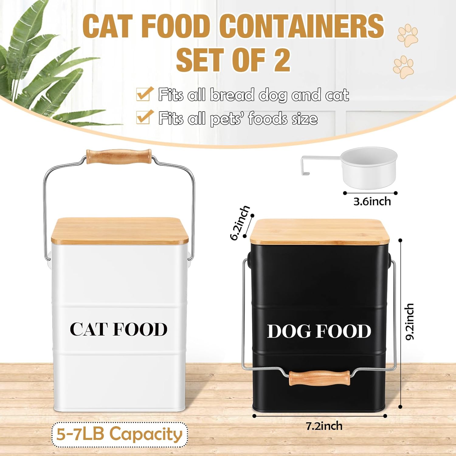 - Make Treats Accessible: this combo set includes 2 metal pet food storage containers, one for dog and one for cat; Each one is 7.09 x 6.10 x 9.06 inch, and one capacity is 5-7 lbs, these pet food storage containers are big enough to easy access to pet food or treats with matching spoon