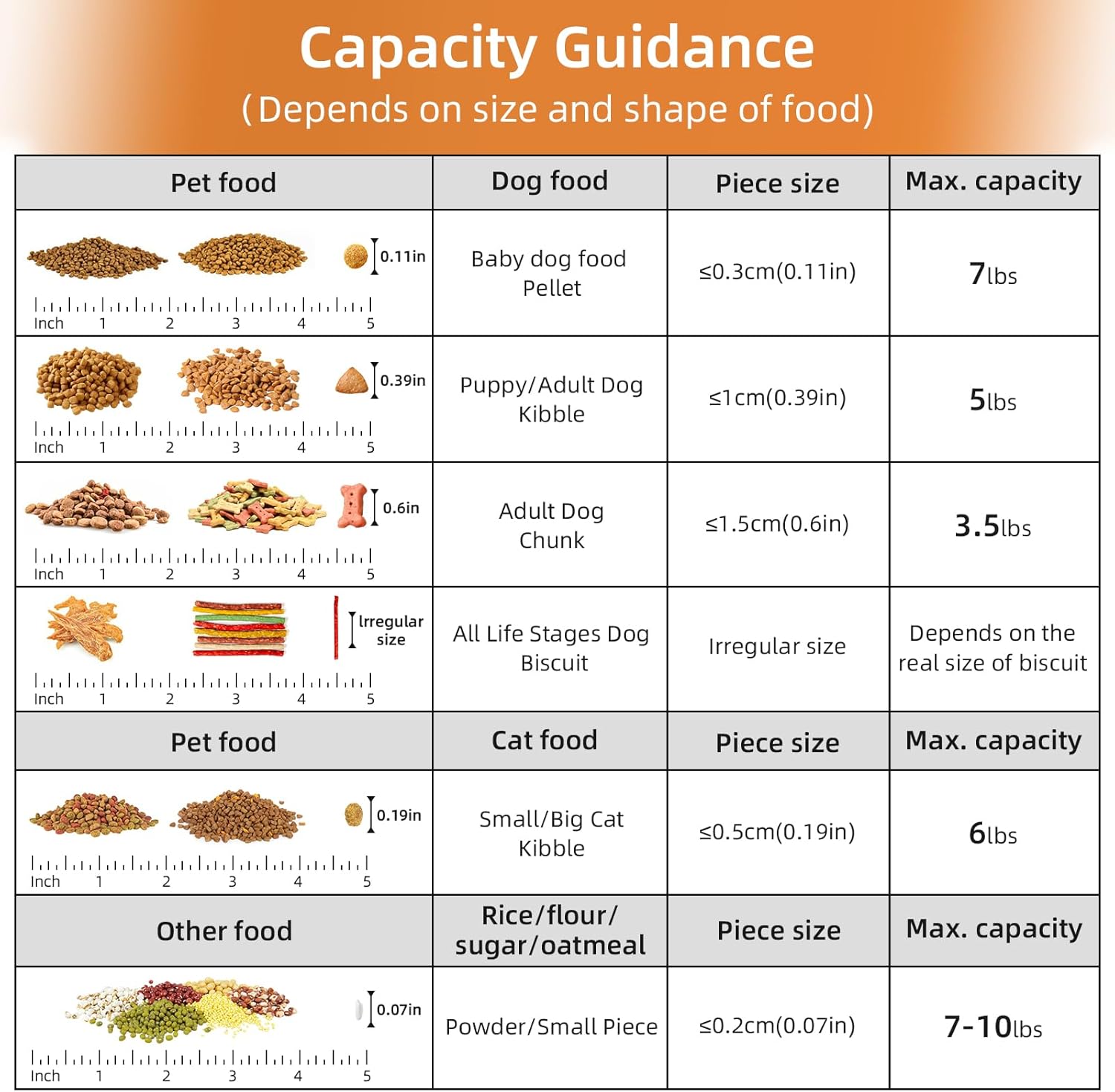 - SUPER LARGE CAPACITY : The airtight cat food Storage container is designed with a large nozzle, so whether it is small or large pieces of food, it can be easily poured out without shaking the barrel. The handle design makes it easy to use and carry indoors and outdoors. It is also convenient to hold with one hand and tip the bucket to pour out food. The size of the pet food container is 14*12*8 inches, with a capacity of 5 liters. It can store pet food for 5 -7LBS, rice, dry food, cereals, etc. is about 10LBS, depending on the size and shape of the food. Can be easily stored and effectively save valuable space whether indoors, outdoors or during travel.