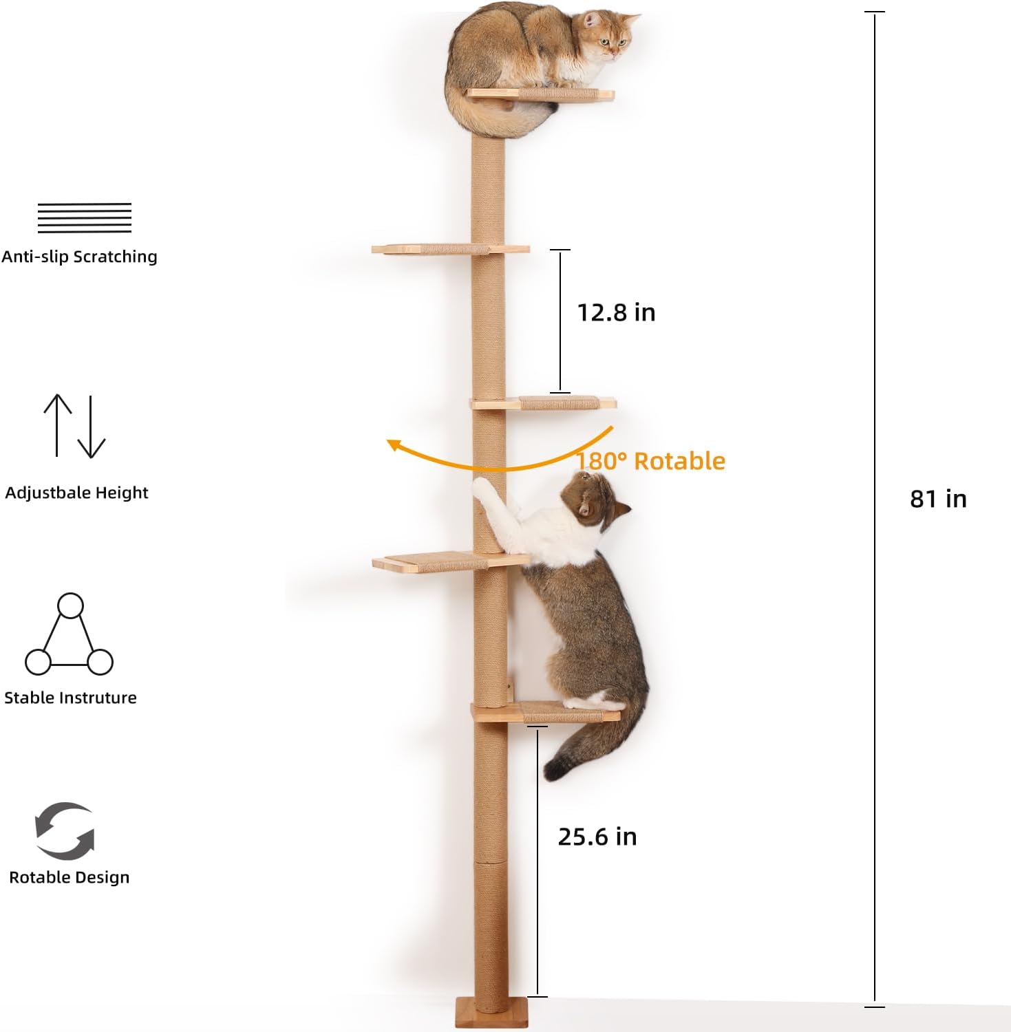 - DIY DESIGN - The scratching post of the cat tree is 360°rotable. You can turn it over and use it on the other side when you find one side is worn. The adjustable height allows the tree to be customized, and the cat platform is not mounted to the wall, giving you the flexibility to DIY a spiral ladder for your cats.