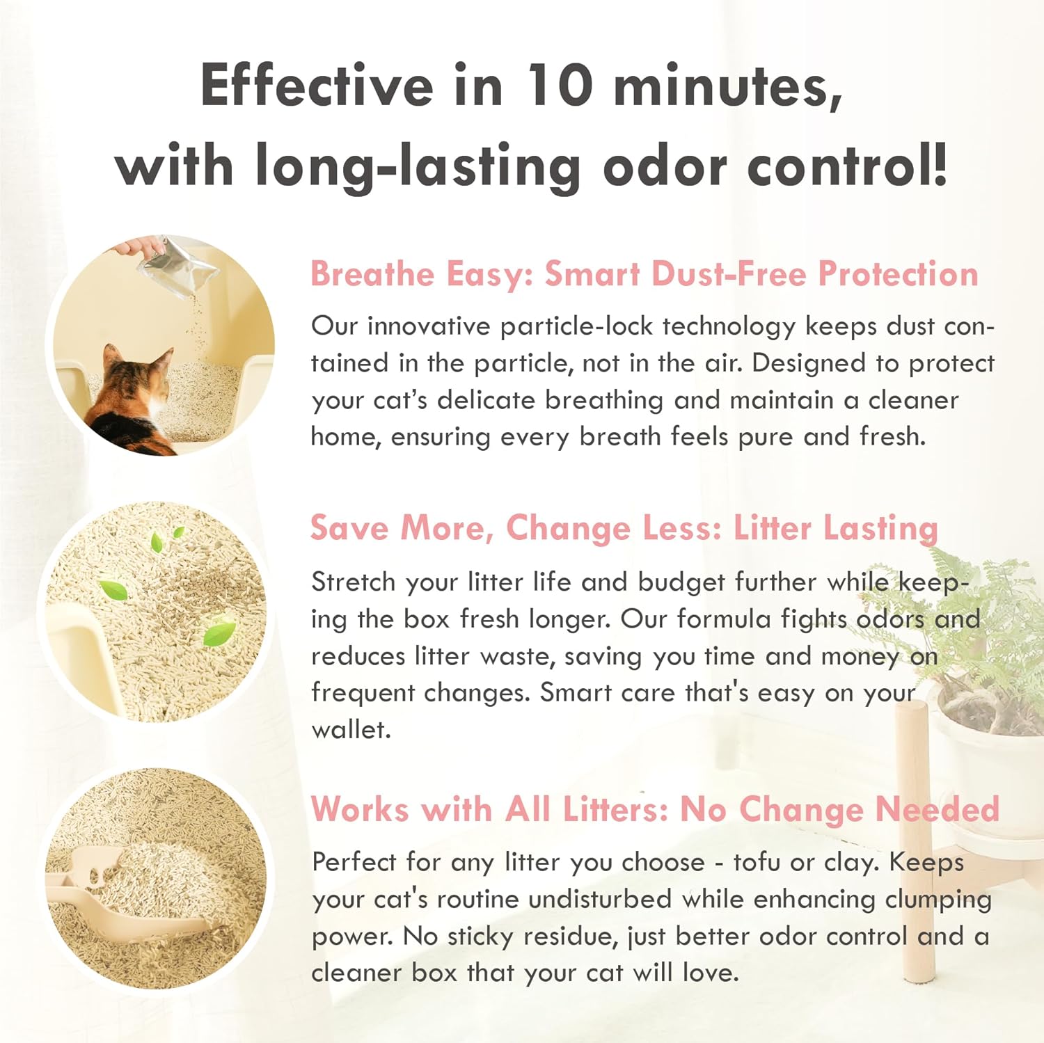 - Long-Lasting Freshness, Less Waste – Each 10g packet refreshes 6 to 9 lbs of litter, extending its lifespan and reducing waste. Use more if necessary for litters with poor odor control.
