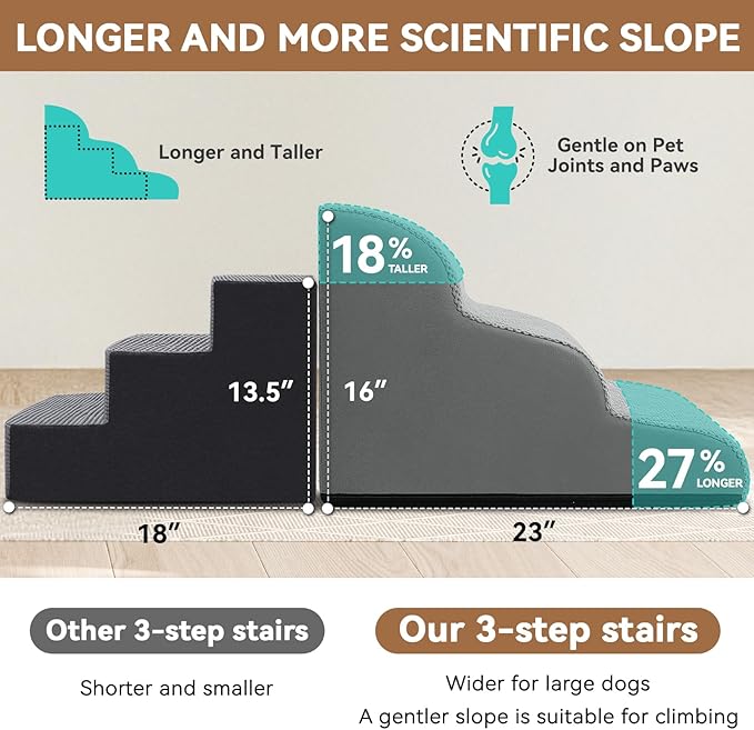 - Specific & Durable Design: Low angle slope design reduces the pressure on joints when pets jump up and down from high bed, sofa, chair and car. Portable handle makes moving stairs easily at home or taking a trip with your pet. The non-slip bottom keeps the stair firmly planted on the ground. No more worrying about your pet slipping and getting hurt! Our foam stair is an essential part of your beloved pet's life! It combines functionality, safety, and durability in one stylish package!