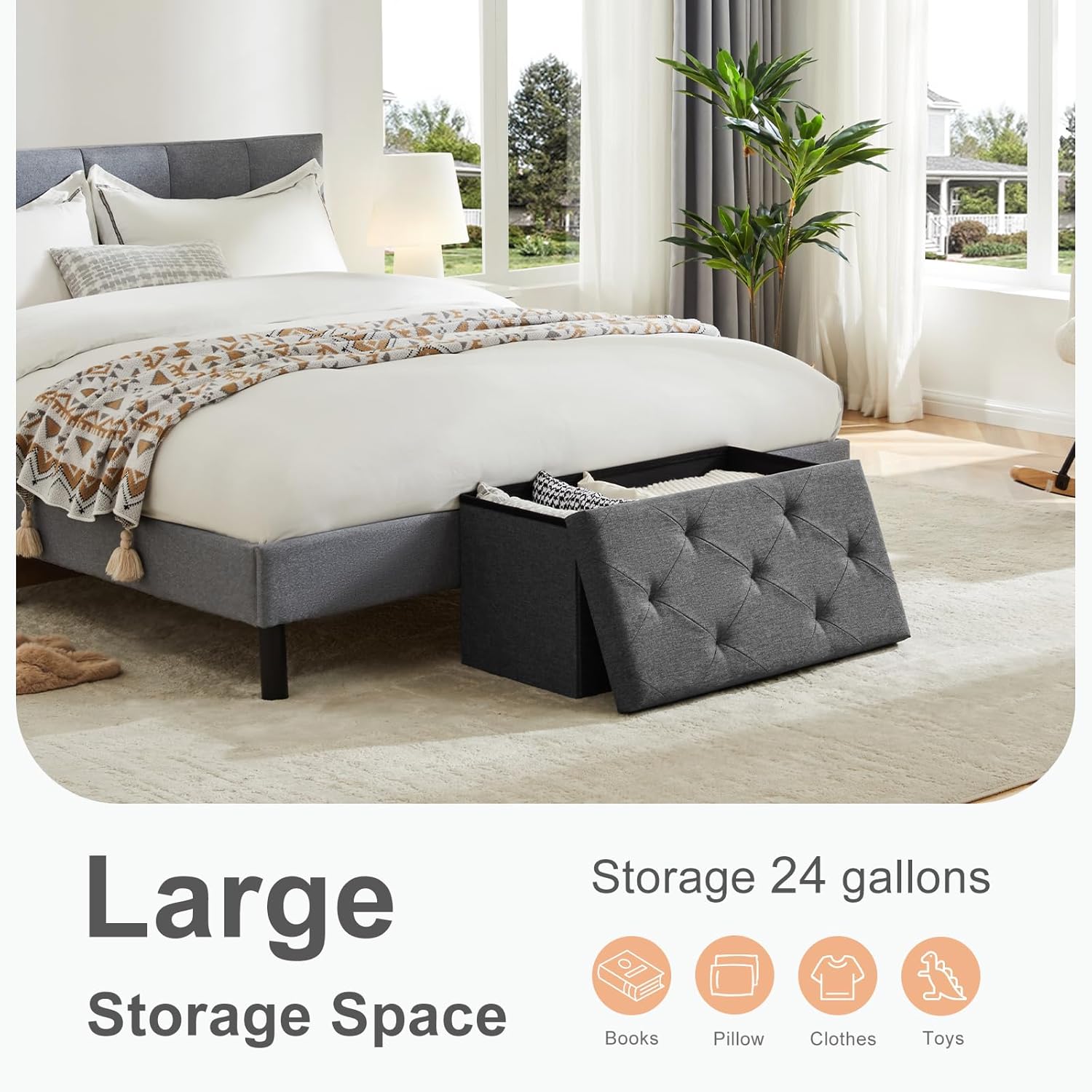- 【Comfortable and Durable】The storage bench is made of high-quality linen fabric, the fabric is comfortable and breathable, and the feel is full and soft. The interior is filled with high-density foam to maintain good support while ensuring comfort. Strong and durable, so that your comfort experience lasting.