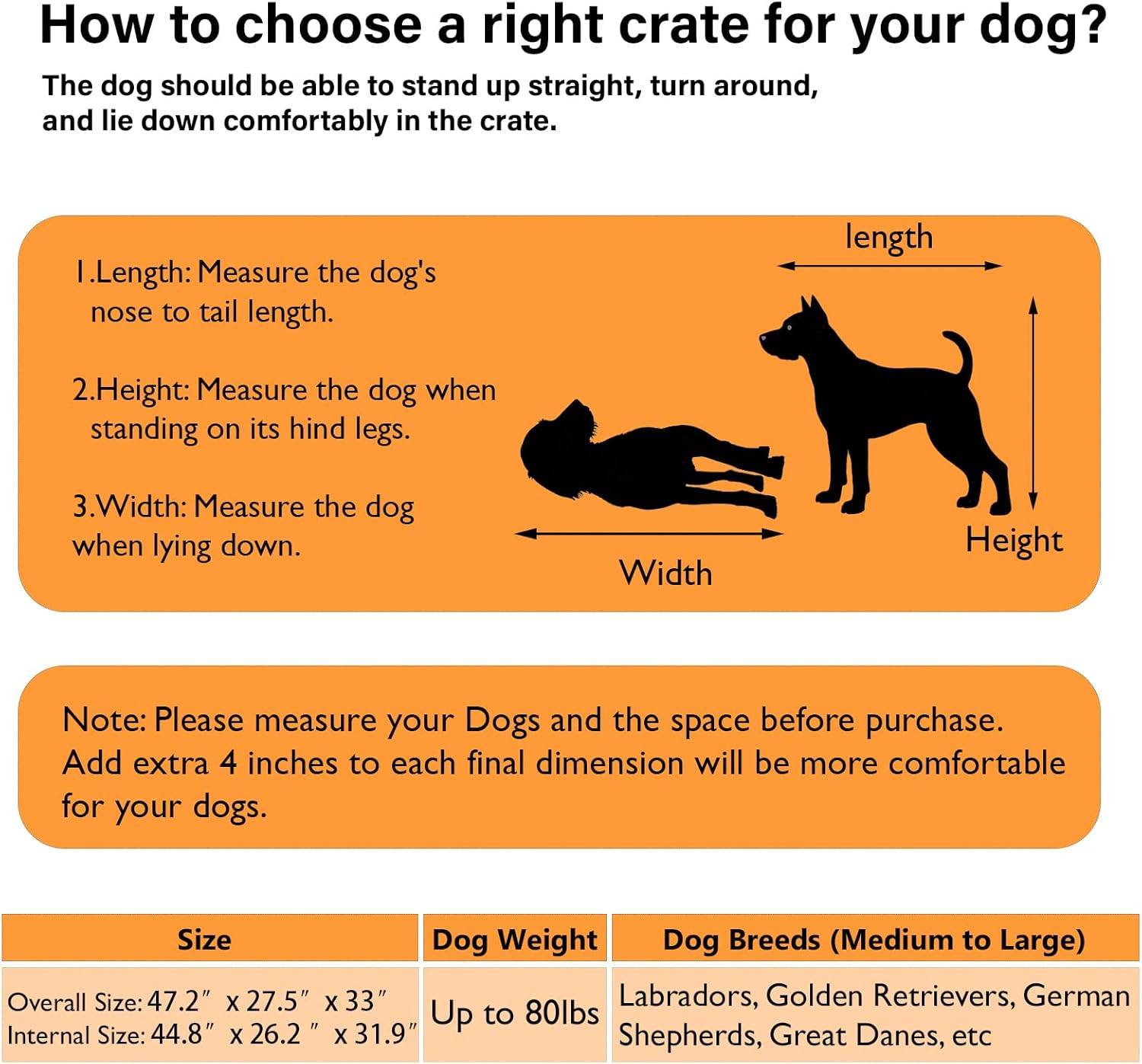 - 【Spacious Interior】 Overall dimensions is 47.2"W x 27.5"D x 33"H. This large dog crate offers ample room for large breeds to stand, turn around, and lie down comfortably. Note: Measure your dog and the space where the dog cage is to locate before purchasing.