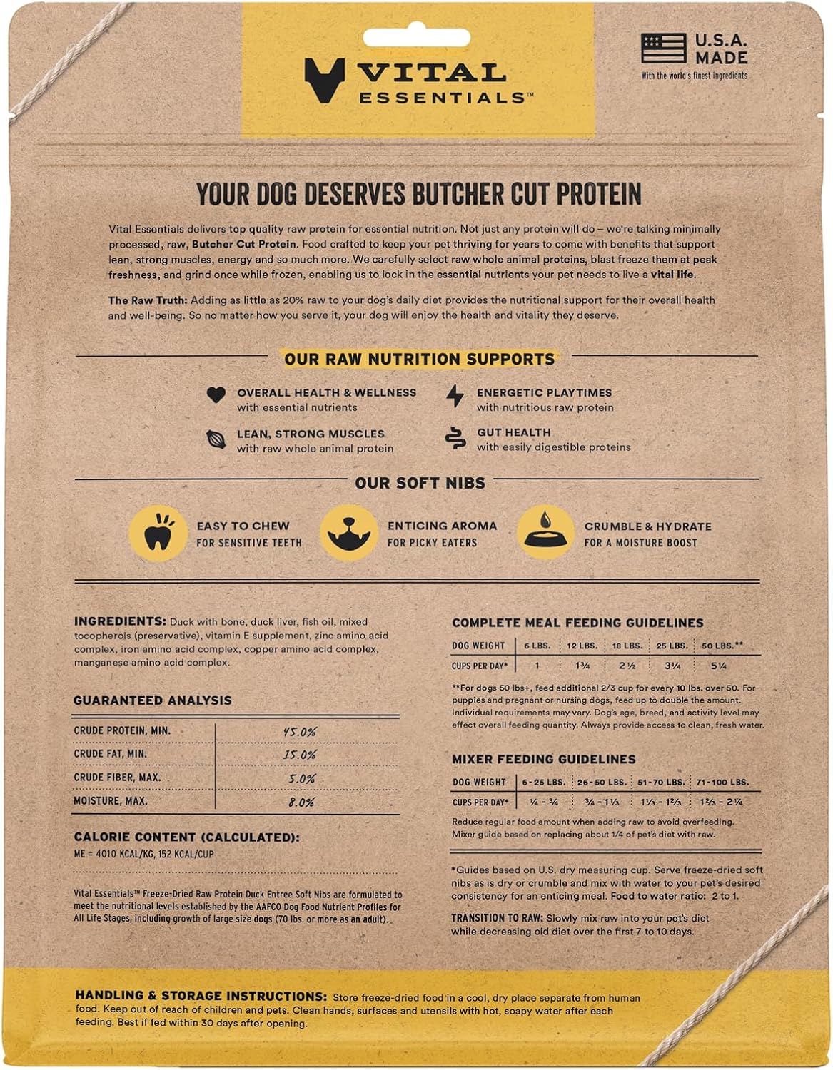 - SOFT NIBS FREEZE-DRIED RAW DUCK DOG FOOD: Vital Essentials Freeze Dried Soft Nibs Dog Food packs more protein than industry standard into every soft bite to deliver the peak vitality your dog deserves, especially when compared to dehydrated dog food. This complete and balanced freeze-dried raw dog food is made with premium Butcher Cut duck, responsibly sourced in the EU.