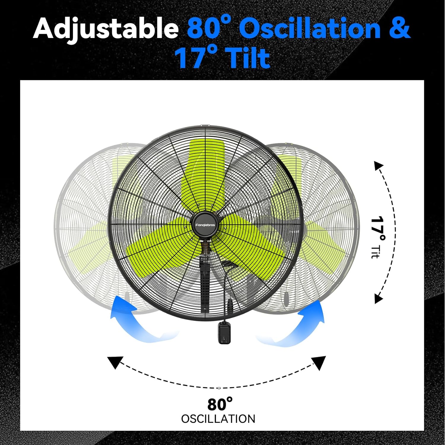 - ๐๐ข๐ฅ๐ญ๐ข๐ง๐ & ๐๐ฌ๐๐ข๐ฅ๐ฅ๐๐ญ๐ข๐ง๐ - The heavy-duty mental wall fan provides an automatic oscillation function of 80 degrees left and right, and the vertical tilt angle can be adjusted up to 17 degrees, helping you easily adjust the wind direction and enjoy the best comfort