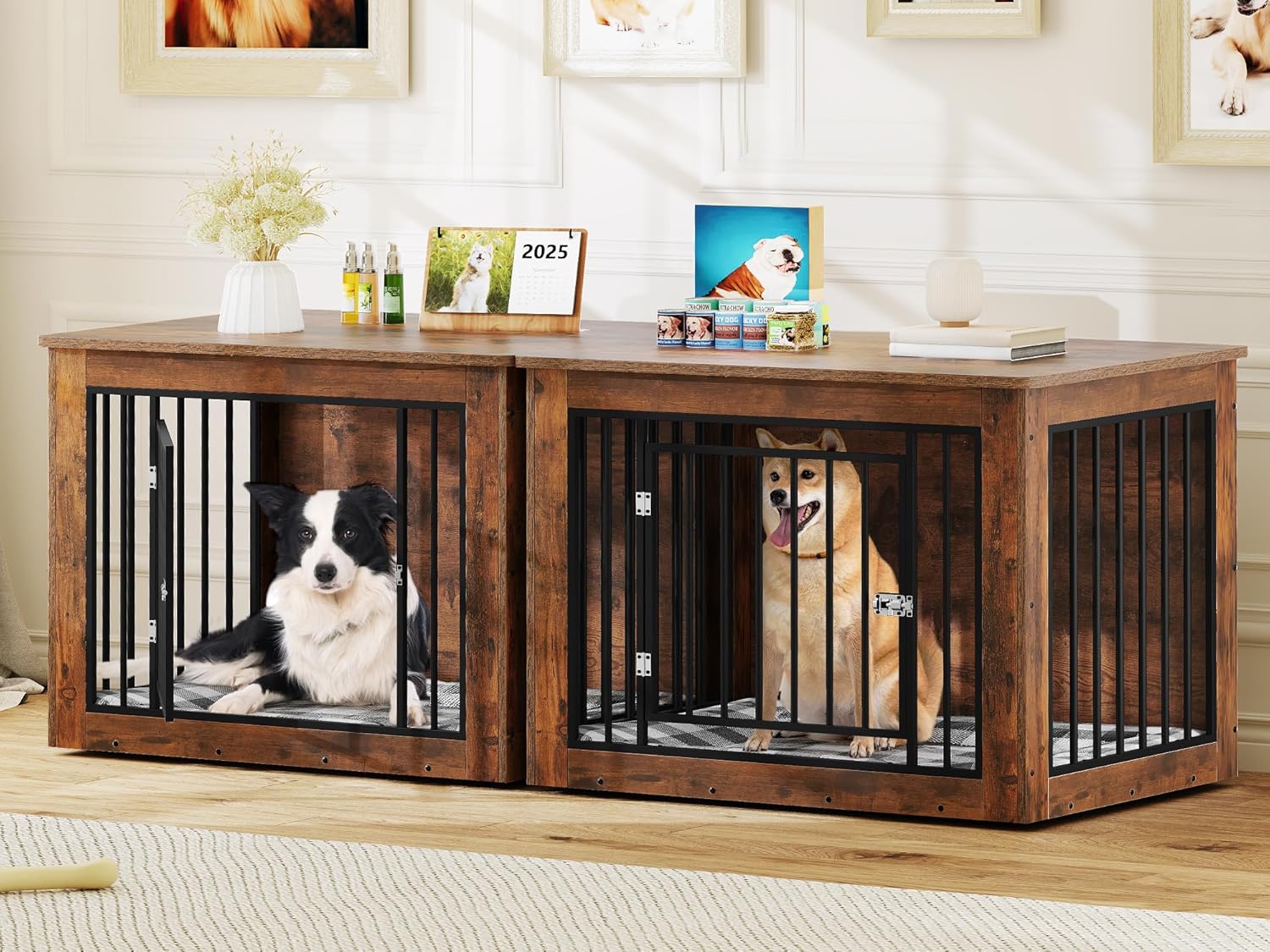 YITAHOME 76 Inch Double Dog Crate Furniture, XXL Dog Crate Furniture for 2 Dogs, Side End Table, Waterproof, Safety Corners, 2-in-1 Iron-Wood Fusion Dog Kennel Furniture for 2 Large Dogs,Rustic Brown