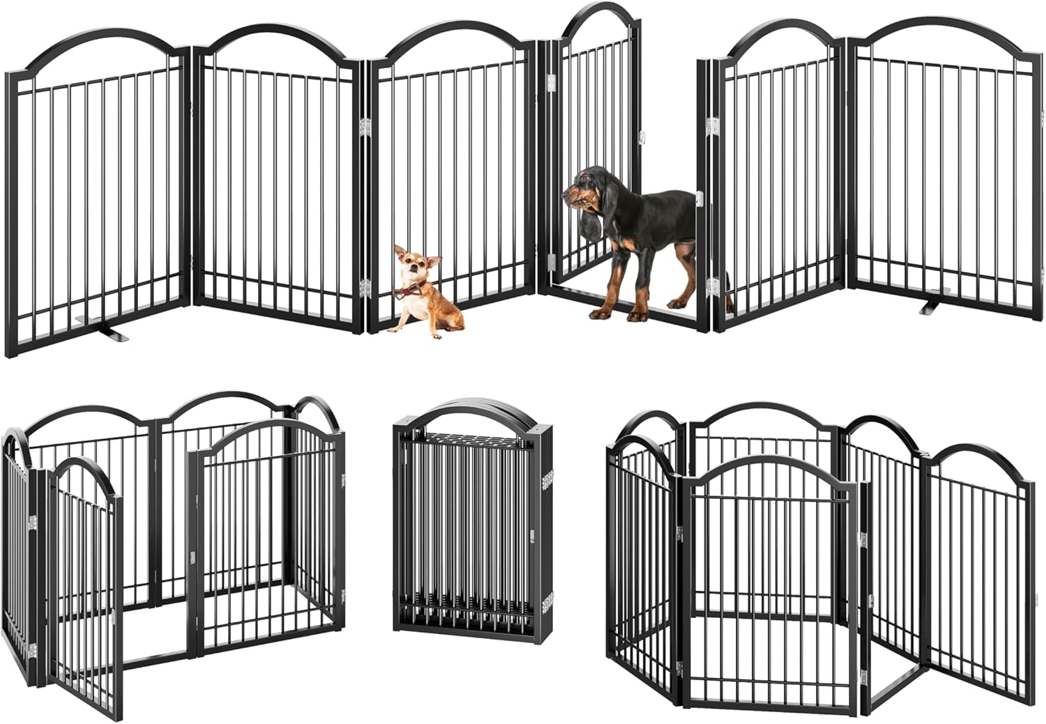 BHG Metal No-Assembly Freestanding Dog Gate with Door Walk Through, Extra Wide 144", Extra Tall 32" Pet Gate, Accordion Puppy Folding Playpen Dog Fence, with 2PCS Support (Black, 6 panesl)