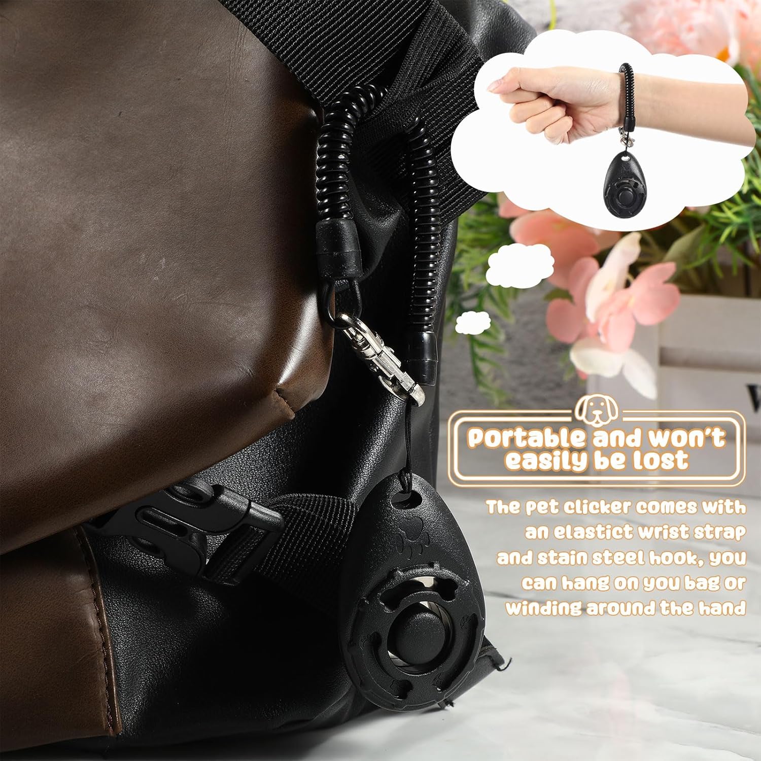 - Easy To Use: The Dog Training Clicker makes it comfortable and secure. It is attached to a keychain ring and elastic bracelet; Wear it on your wrist or hang it up or attach it to your handbag, so you don't drop it and can access easily and quickly; Wrist attachment makes it more comfortable and easier to hold onto, than box clickers when training your pet