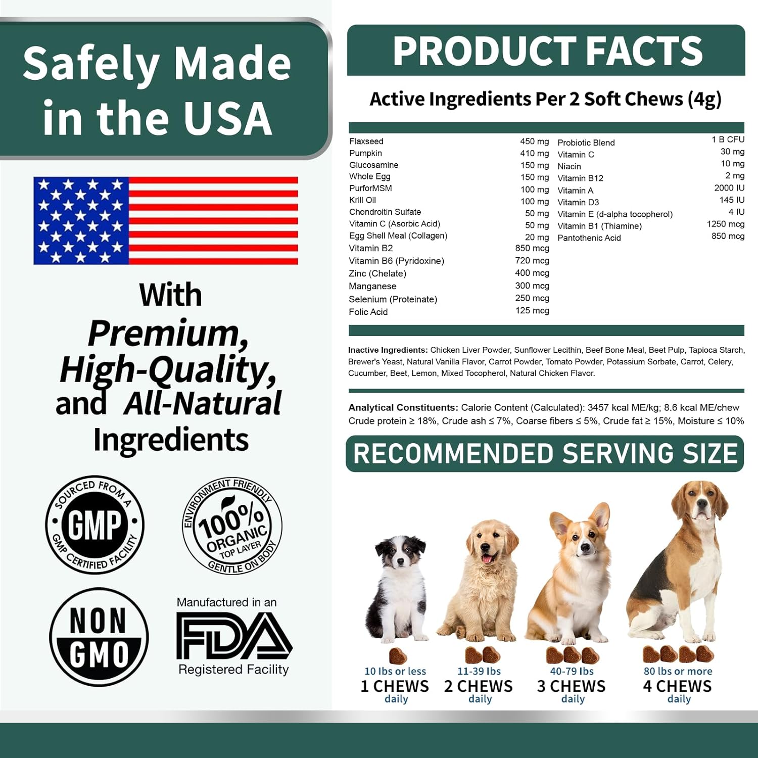- Nourishes Skin & Coat with Omegas – Enriched with eggshell meal and krill oil omegas, these chews provide the nutrients needed to soothe dry, itchy skin and promote a stronger, shinier coat. Your dog will look and feel healthier from head to tail.