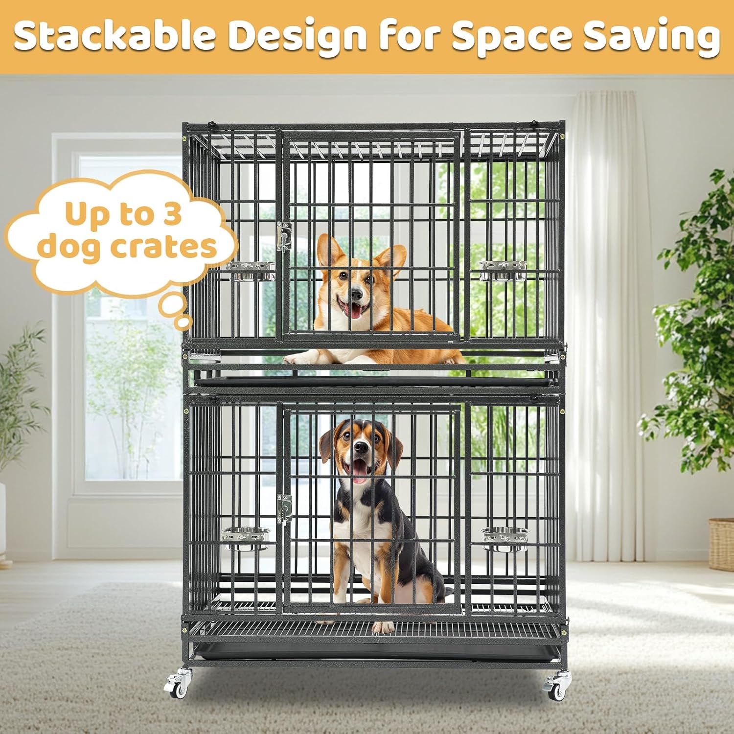 - Stackable Design:Stackable Heavy Duty Dog Crate - Up to 3 dog cages can be stacked vertically, saving space, perfect for animal shelters, veterinary clinics and kennels. This durable dog crate is perfect for dogs with high anxiety levels, providing a safe and comfortable space in a busy environment, reducing your dog's stress