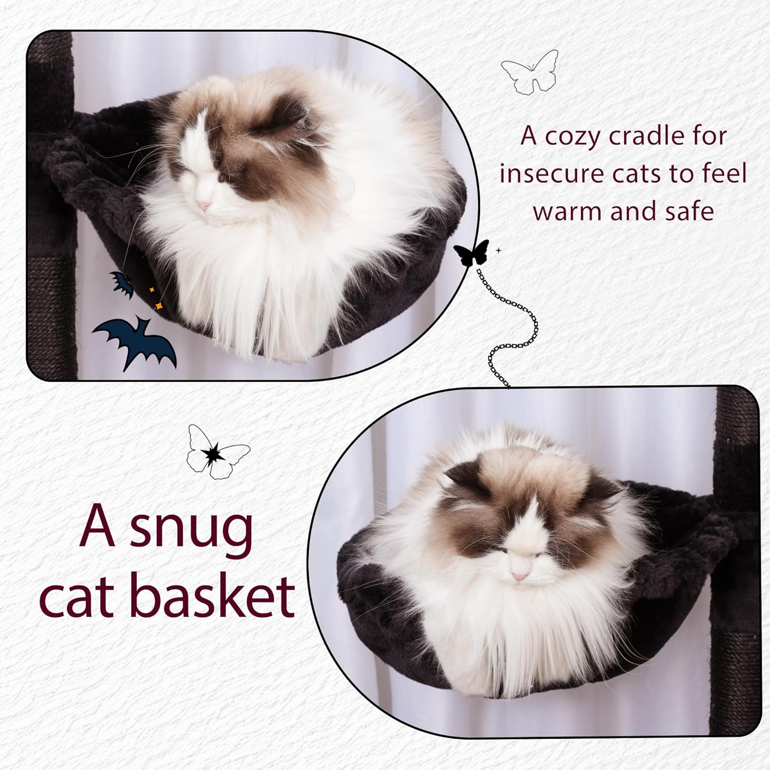 - 2 Basket-Shaped hammocks: The hommock on cat house is cat's favorite, giving kitties a feeling of been wrapped up, like sleeping in a soft cloud. There are two!