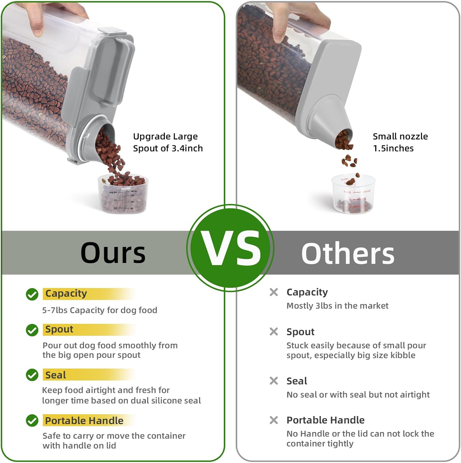 - BENEFITS : Upgraded Large Pour Spout with Measuring Cup-We upgraded the mold so that the pour spout is large enough to pour out large dog food.You can now pour food easily and quickly.The newly upgraded measuring cup can now also be easily screwed onto the nozzle