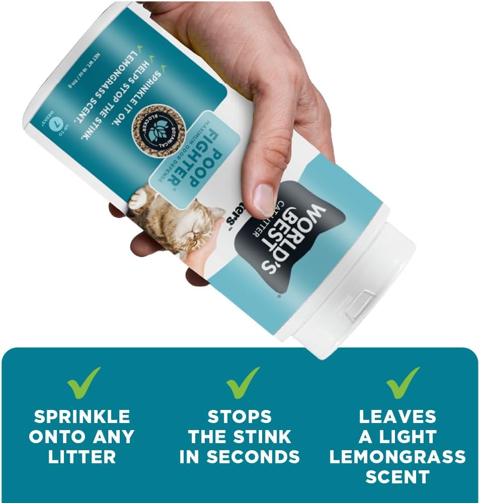 - ELIMINATES ODORS: World’s Best Cat Litter Boosters Poop Fighter is a natural and sustainable cat litter additive that helps eliminate poop, urine, and ammonia odors, not just mask them. Simply sprinkle it on to your usual litter for a deodorized litter box.