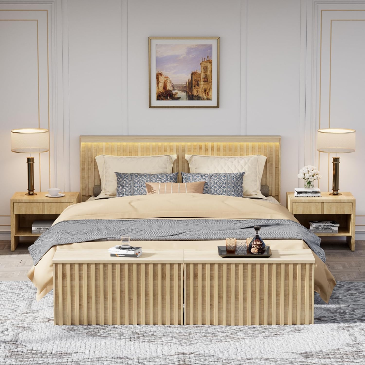 UEV Storage Bench Set of 2, 39.4" Wood Storage Trunk with 2 Safety Hinges, Sturdy Storage Chest, Fluted Storage Bench for Bedroom, Shoe Bench for Entryway, Living Room (Ivroy White)